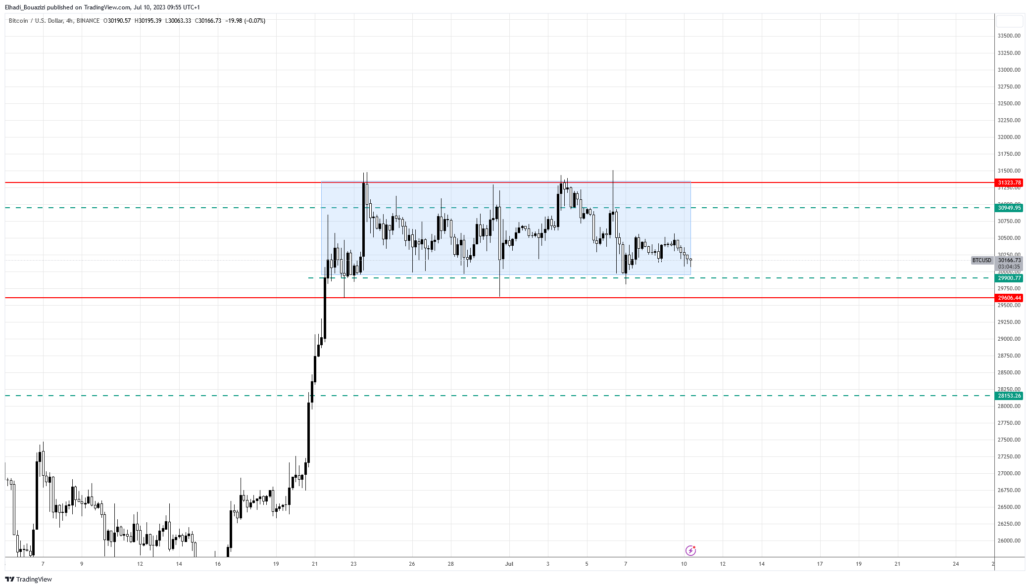 استمر بيتكوين وسوق العملات المشفرة في التحرك بشكل جانبي للأسبوع الثاني على التوالي. حيث تنحصر تداولاتها بين 29900 و31300 دولار. على الرغم من صدور محضر اجتماع المجلس الاحتياطي الفيدرالي إشارته إلى المزيد من التشديد النقدي على الأقل فيما تبقى من أشهر العام الجاري.