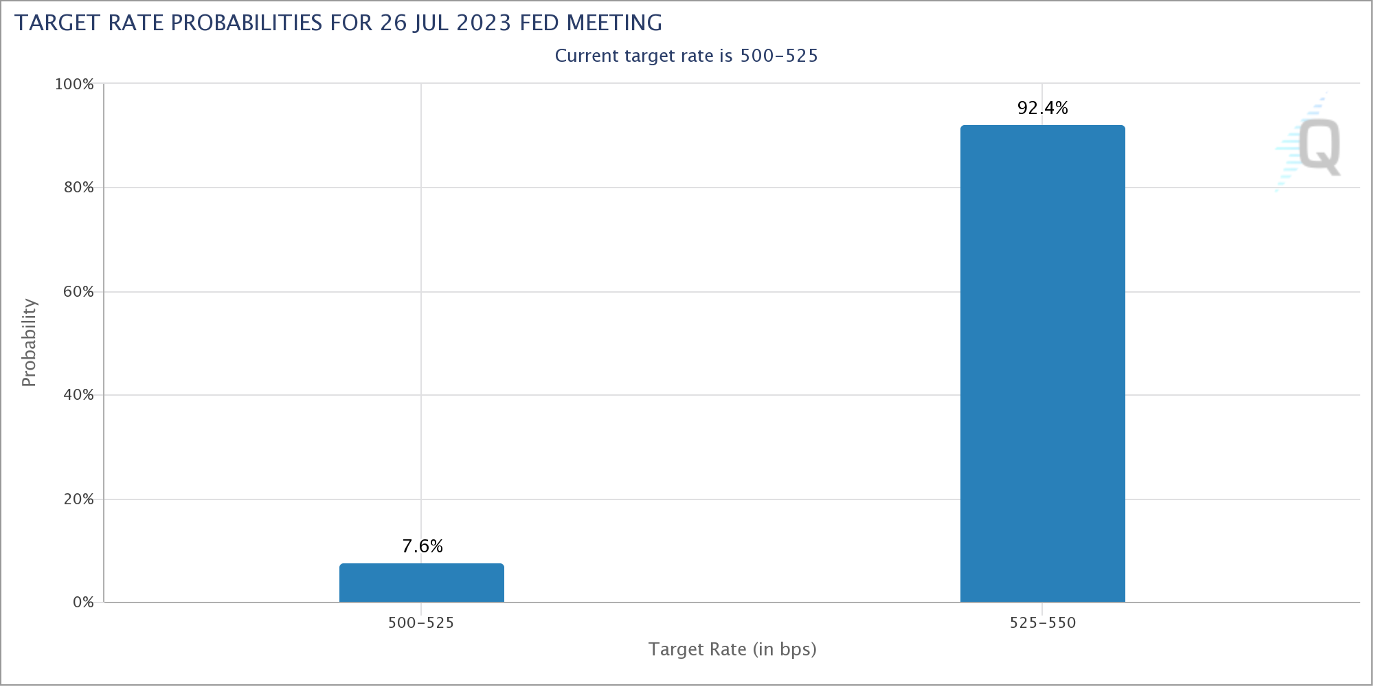 وحسب لأداة CME FedWatch، فإن احتمالية رفع أسعار الفائدة بواسطة الاحتياطي الفدرالي في 26 يوليو حاليًا تبلغ 93% بنسبة كبيرة. من المرجح أن تنخفض هذه الاحتمالية كثرا إذا كانت أرقام مؤشر أسعار المستهلك الأساسي السنوية والشهرية Core CPI أقل من المتوقع.
