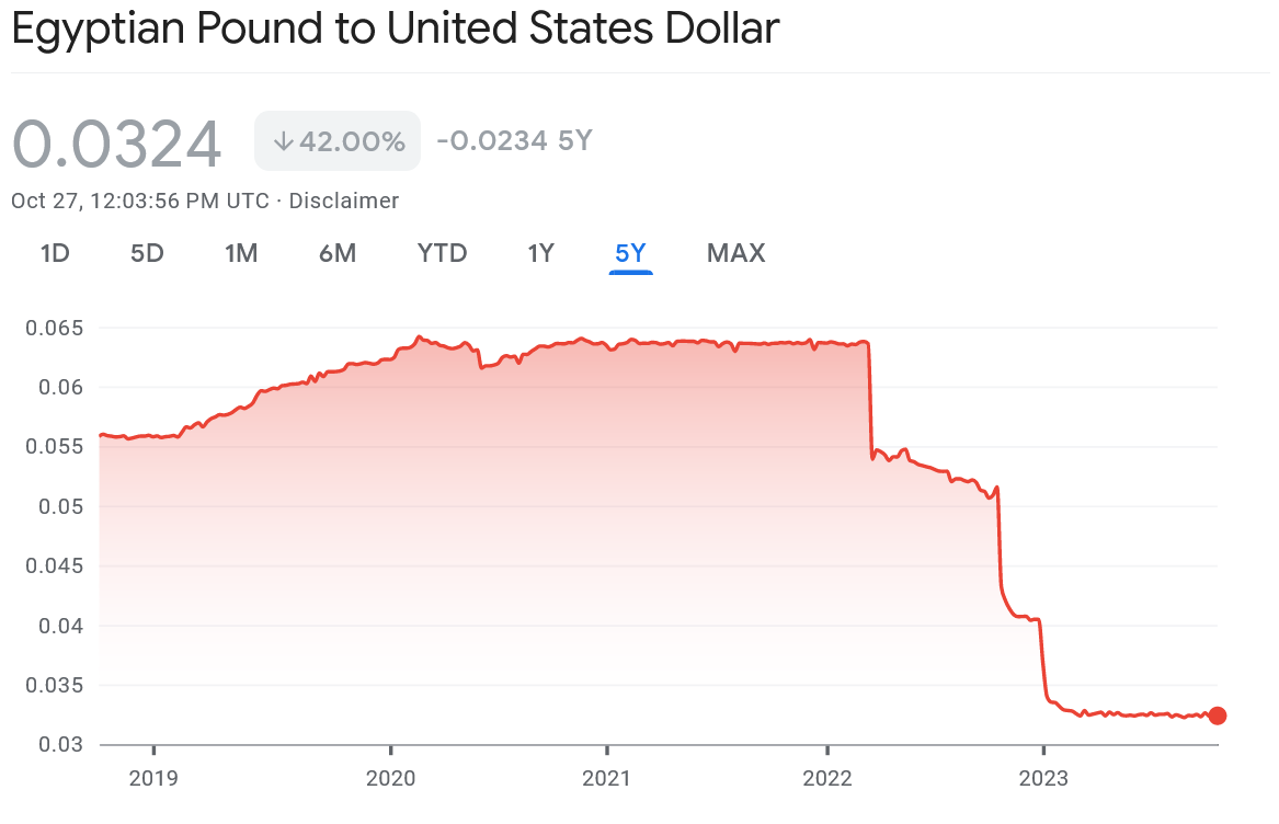 وانخفضت قيمة الجنية المصري حولي 42% مقابل الدولار الأمريكي في 5 سنوات الماضية. وهذا العام بذات، كان الأسوأ للعملة المصرية التي فقدت 20% م نقيمتها أم العملة الخضراء.