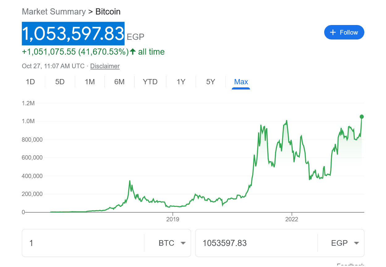 يتداول سعر البيتكوين BTC حاليًا عند 34000 دولار في منصات تداول العملات العالمية. بعيدًا جدًا عن أعلى مستوياته التاريخية عند 69000 دولار. ولكن عند حساب قيمتها بالعملات المحلية لبعض البلدان التي تعاني من معدلات تضخم عالية من بينها مصر. نجد أنه قد وصل إلى أعلى مستوياتها التاريخية مقابل الجنيه المصري.