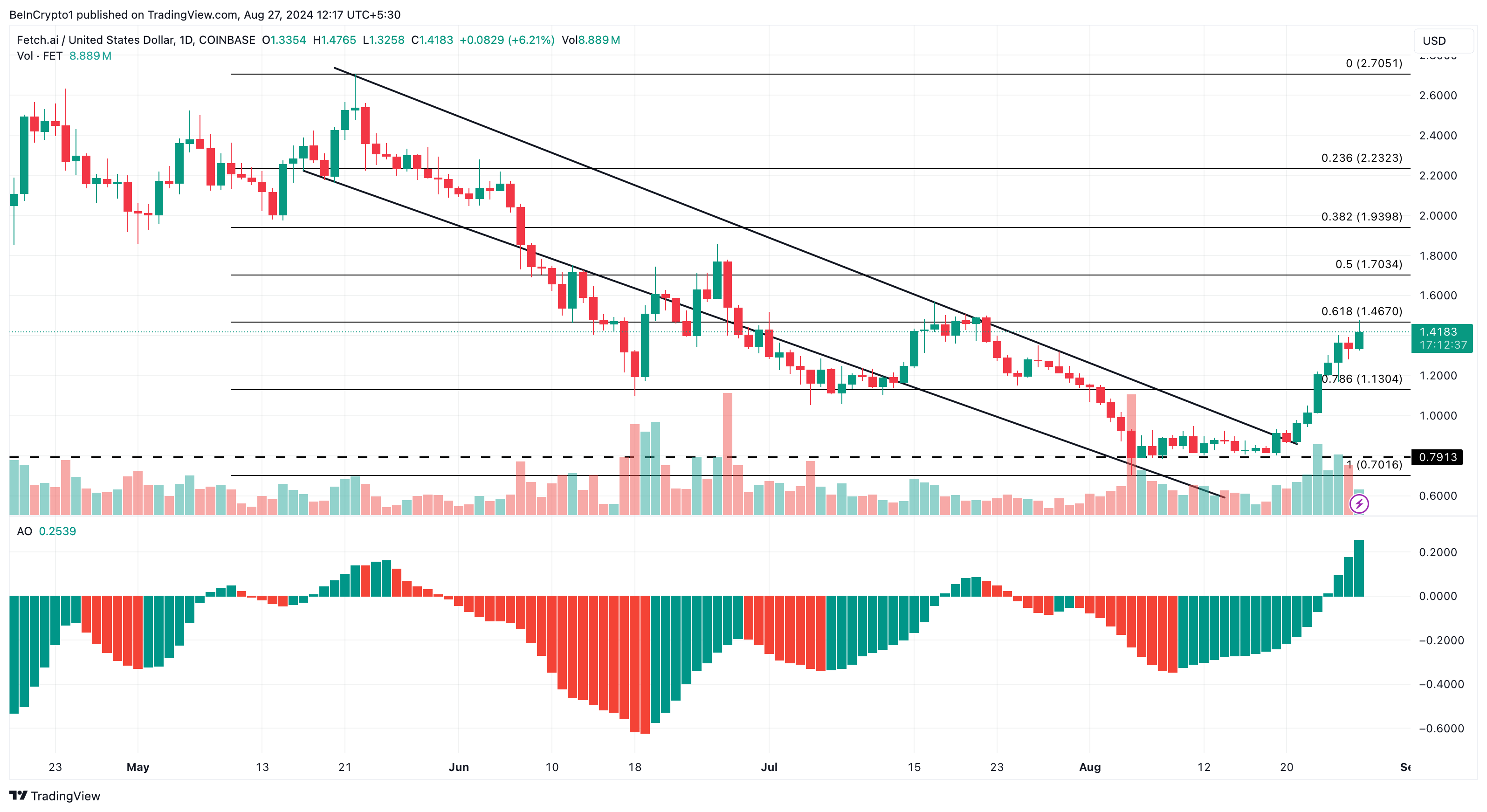 إذا استمر الزخم الصعودي في الرسم البياني اليومي لـ FET، من المحتمل أن يرتفع سعره أكثر. استنادًا إلى مستويات تصحيح فيبوناتشي، قد يتجاوز FET 1,70 دولار وقد يصل حتى إلى 1,93 دولار قبل تقرير الأرباح.
