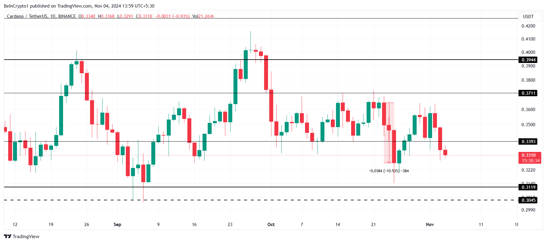 كان سعر كاردانو غير مستقر منذ أكتوبر، دون تحقيق مكاسب كبيرة. حاليًا، يتداول ADA أدنى من مستوى الدعم الحرج البالغ 0,339 دولار، مما يبرز التحديات المستمرة في الحفاظ على الزخم. يبقي هذا الفقدان للدعم السوق حذرة.