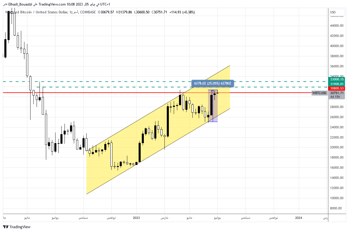 سعر عملة WBTC كان يتحرك في قناة سعرية صاعدة منذ بداية العام الجاري. ولقد بدأت الموجة الصاعدة الأخيرة عندما لامس السعر الحد السفلي لهذه القناة.