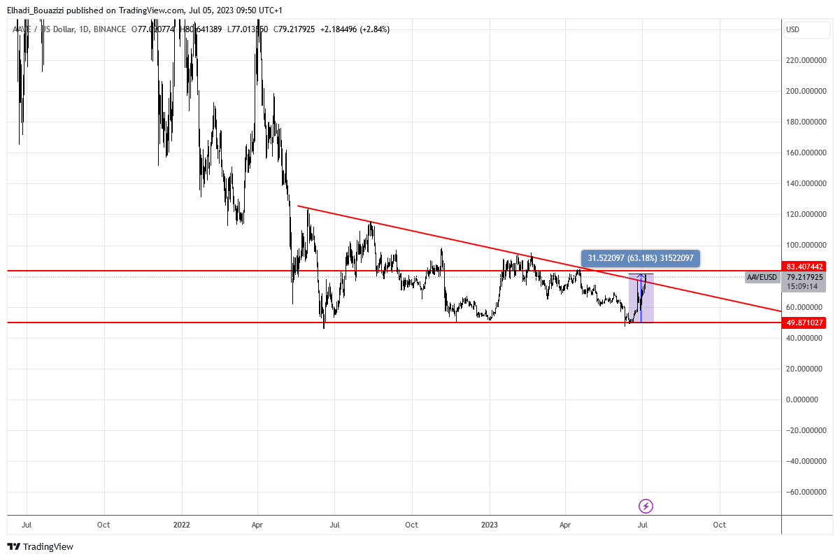 سعر عملة AAVE يتحرك تحت خط اتجاه هابط منذ مايو 2022. ولكن بعد موجة الارتفاع الأخيرة السعر تنمكن من الإغلاق الشمعة اليومية فوق مستوى الخط ثم استمر في الارتفاع.