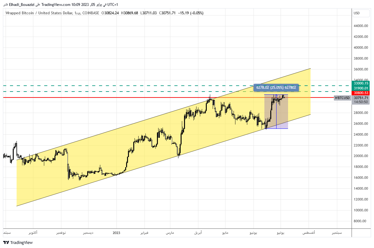 وهذا شرط أساسي لتأكيد الاختراق واستمرار الصعود نحو المستوى 31900 دولار ثم مستوى 33000 دولار.