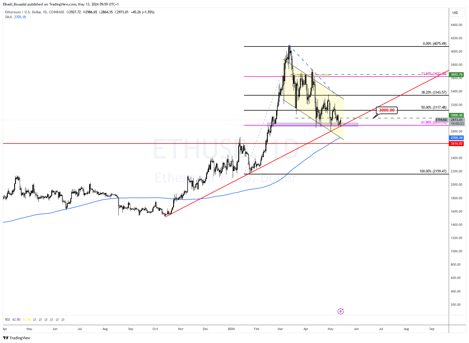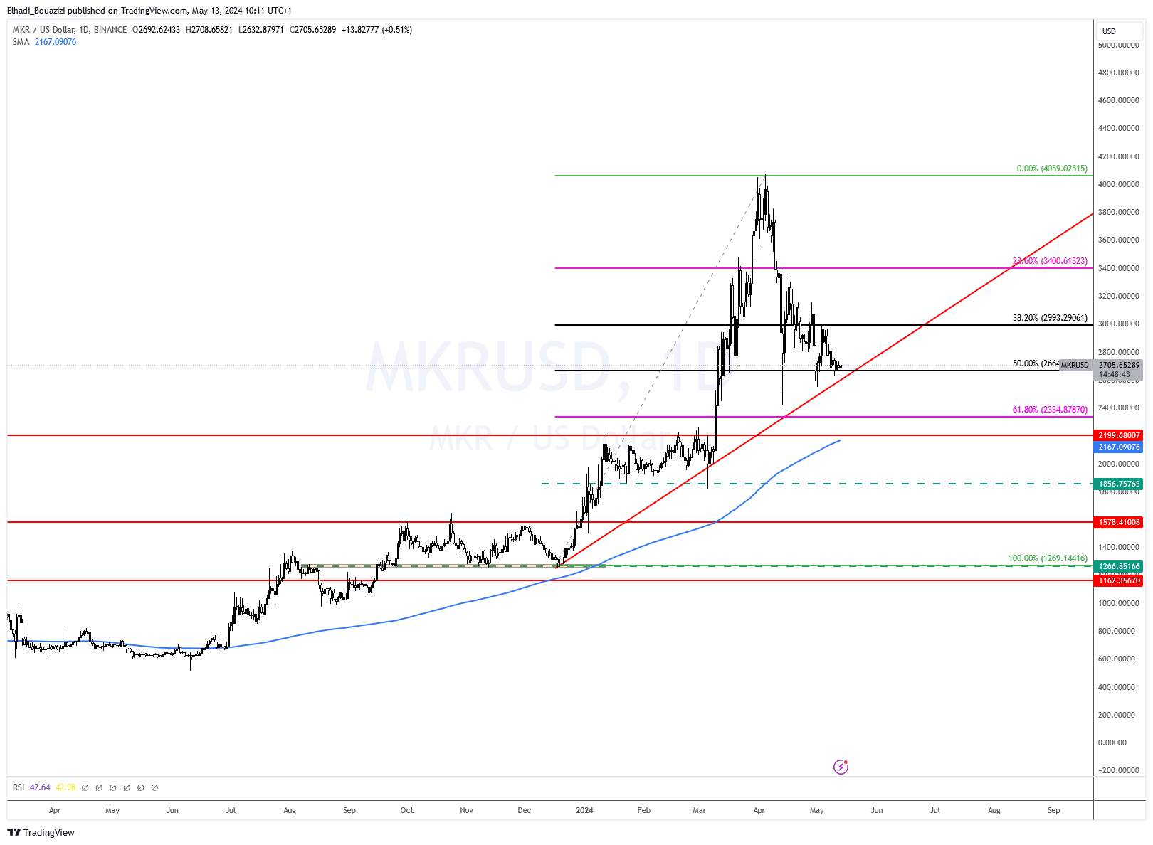 الآن، سعر عملة مايكر MKR يلامس مستوى دعم قوي، و مثل سعر إثيريوم ETH، يتكون من خط الاتجاه الصاعد وتصحيح فيبوناتشي 50% عند سعر 2700 دولار.
