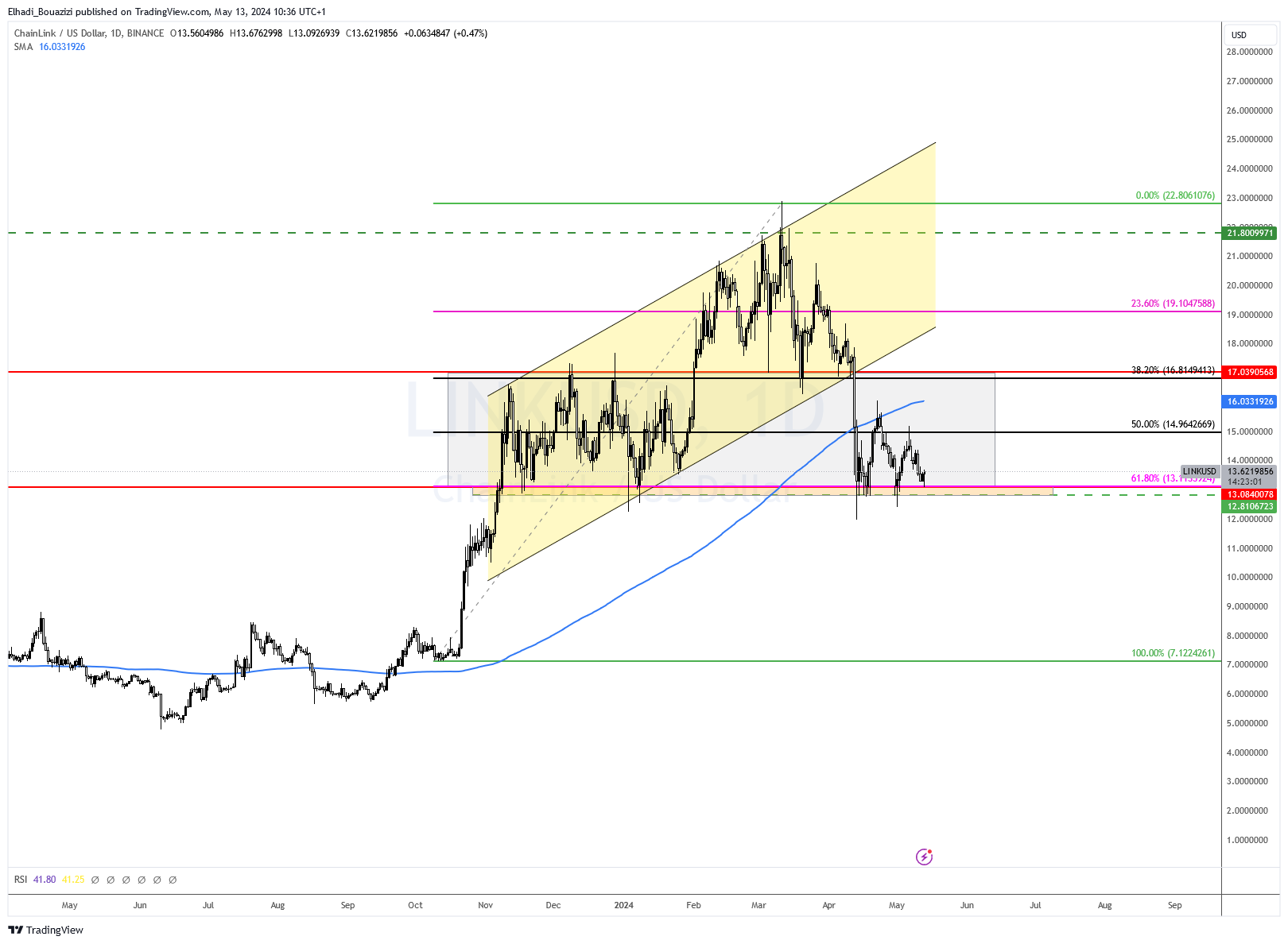 على الرسم البياني اليومي، سعر عملة LINK يتداول داخل قنوات سعرية عرضية محصورة بين 13 – 17 دولار التي تمثلان تصحيحات فيبوناتشي 61.8 – 38.2 على التوالي.