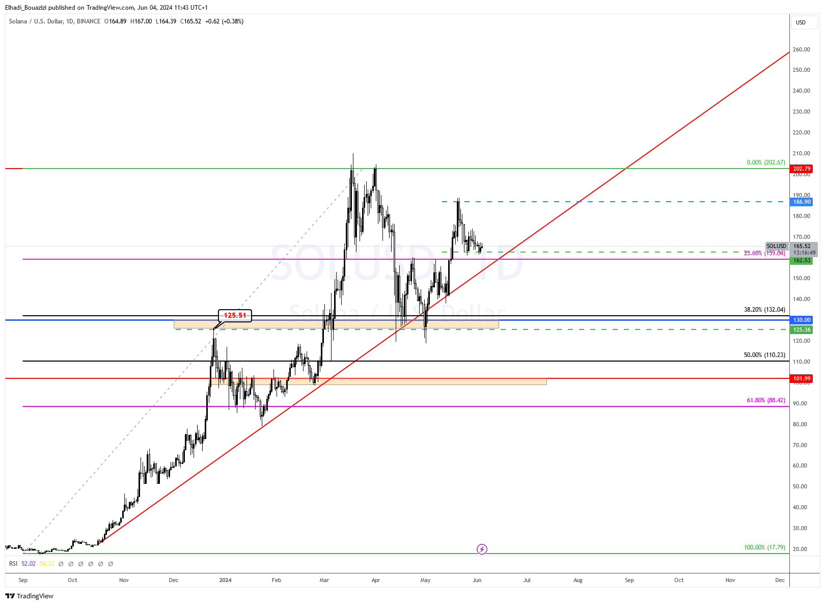 سعر عملة سولانا SOL صحح بعد أن بلغ قمته عند مستوى 200 دولار في منتصف شهر مارس الماضي. و منذ ذلك الوقت يتداول ضمن مستويات تصحيح فيبوناتشي و خط الاتجاه الصاعد.