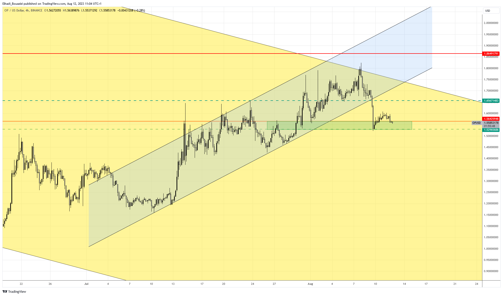 سعر أوبتيميزم عملة OP لم يتمكن بعد من كسر منطقة الدعم 1.52 – 1.56 دولار. وبالتالي فنيا. لم يحدث بعد تغير في اتجاه السعر.