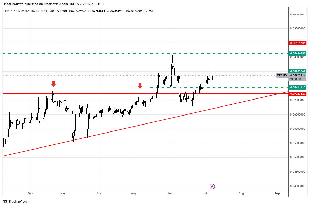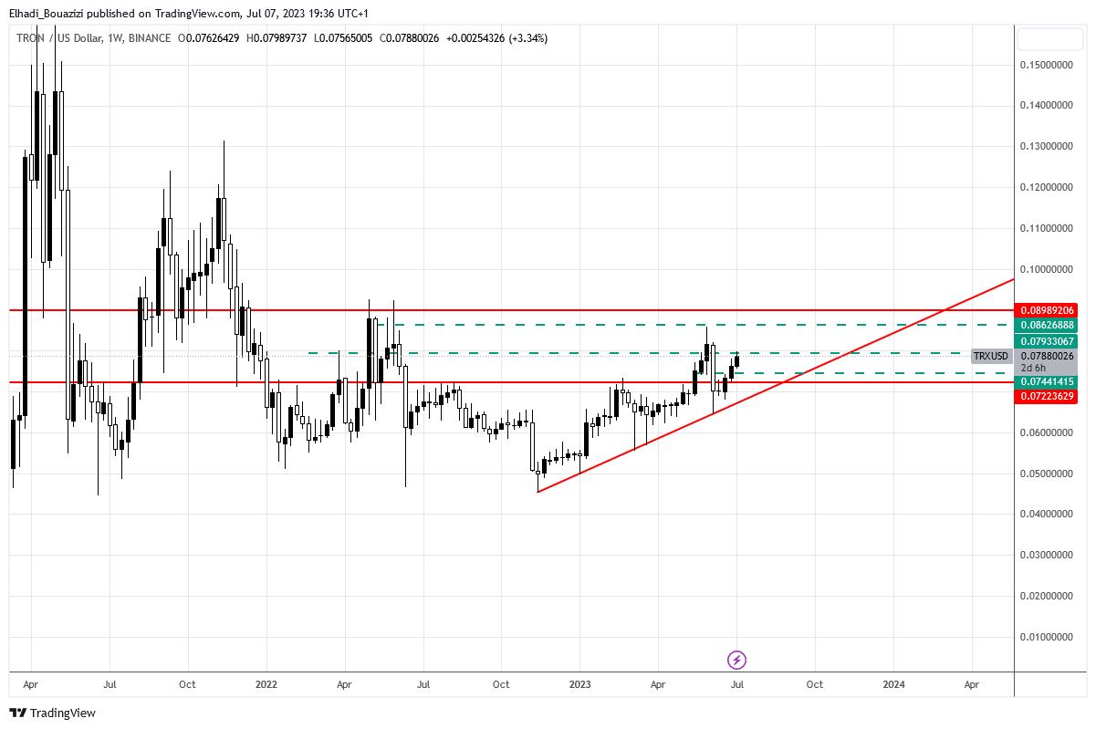 على الرسم البياني الأسبوعي نلاحظ أن سعر عملة ترون يتحرك في اتجاه صاعد منذ منتصف نوفمبر من العام الماضي. حين بلغ السعر أدنى مستوياته في العامين الماضيين مباشرة بعد انهيار بورصة FTX.