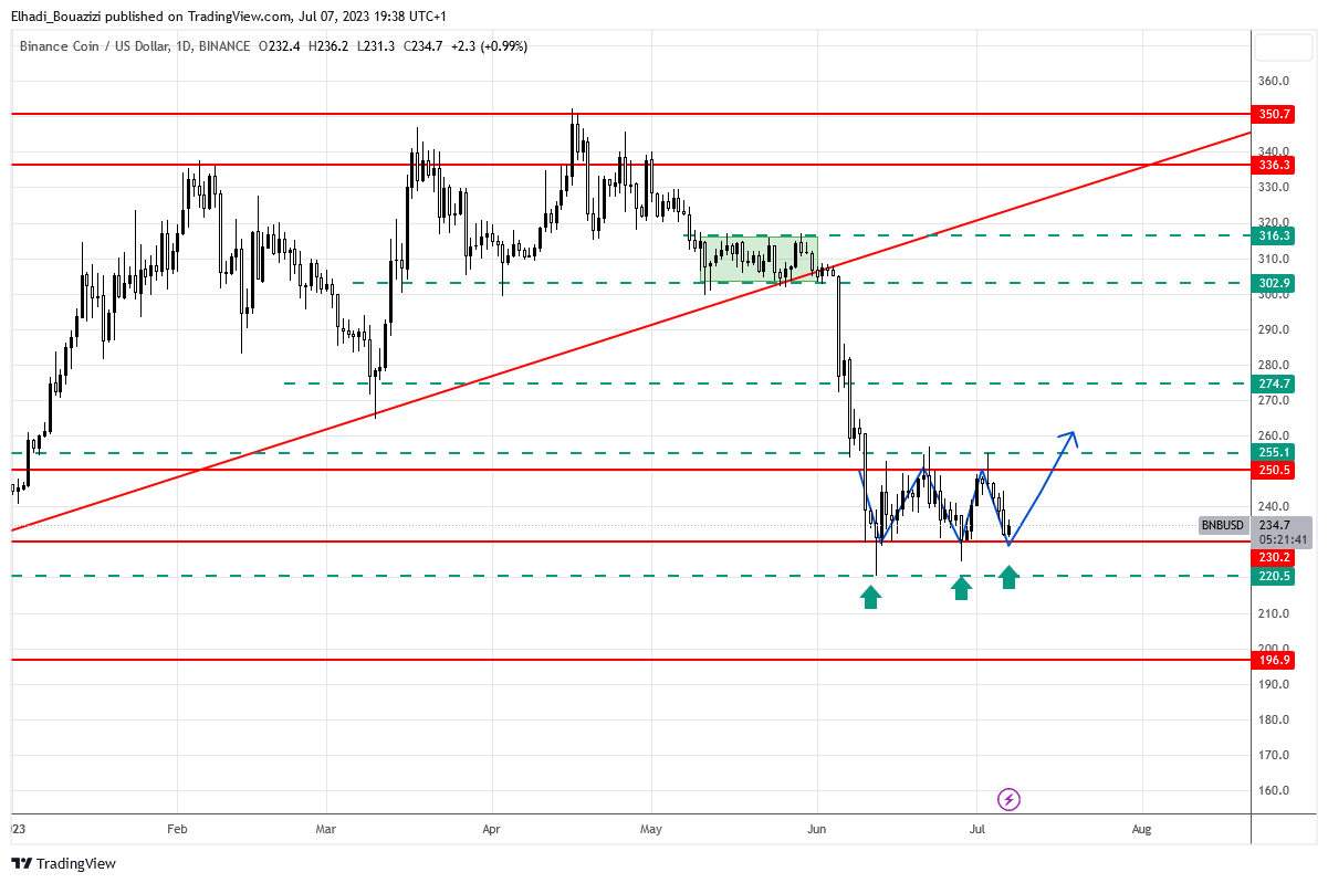 وسعر BNB لم يستفد كثيرا من موجة التفاؤل في السوق. ولكنه أيضا لم ينهار واستقر في تداولات محصورة بين 230 – 250 دولار.