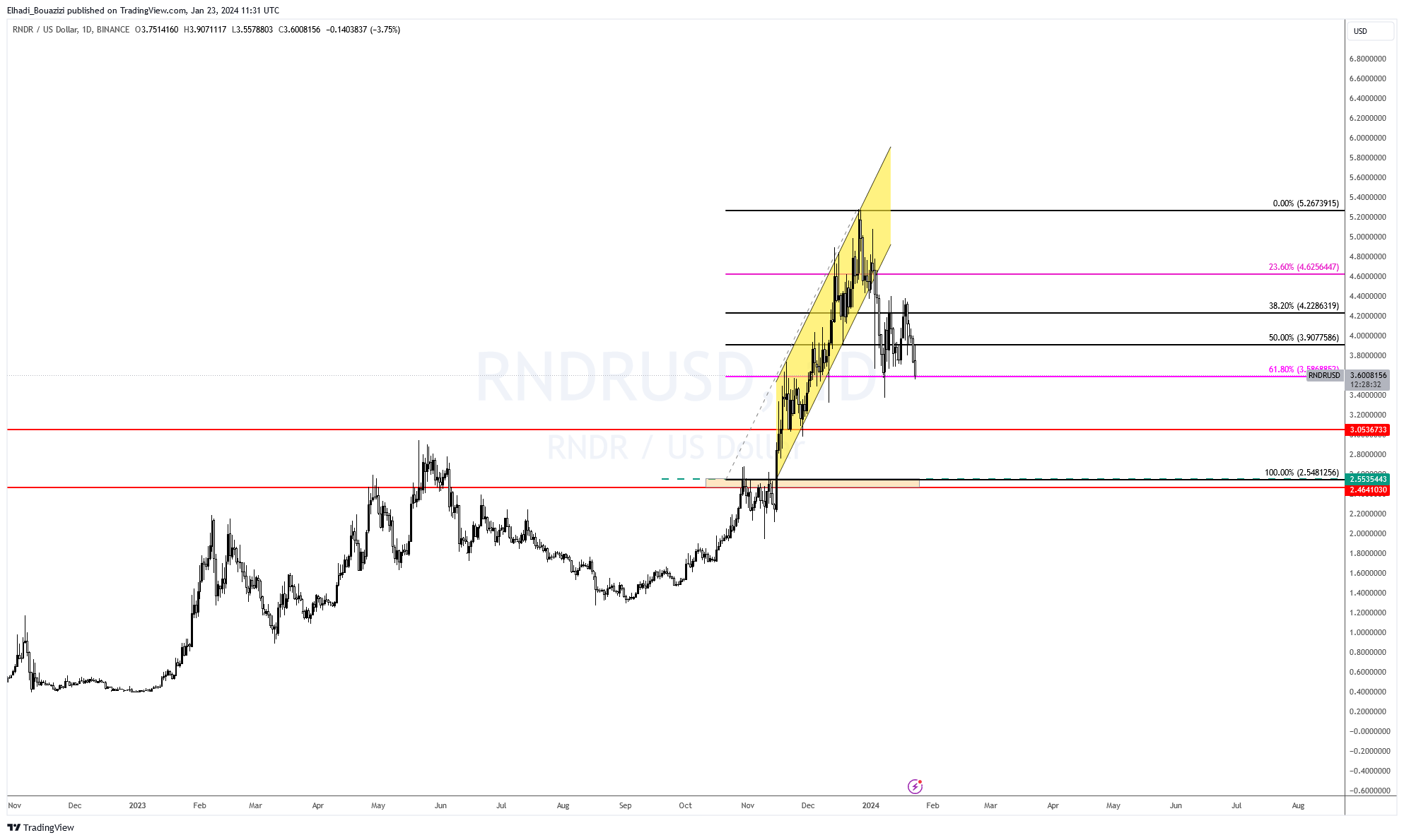سعر RNDR يتداول الآن بالقرب من تصحيح فيبوناتشي 61.8 عند سعر 3.59 دولار . و هذا مستوى دعم جيد قد يمثل فرص للشراء.