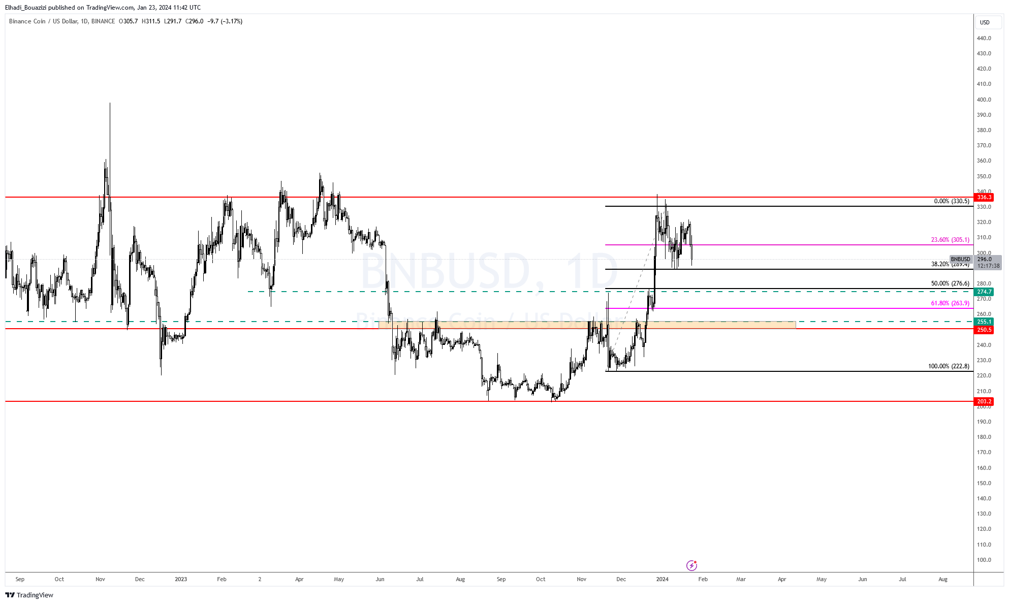 وارتد سعر BNB حتى لامس مستوى تصحيح فيبوناتشي 38.2 عند سعر 290 دولار. و لقد عاد الآن لاختباره مرة أخرى.