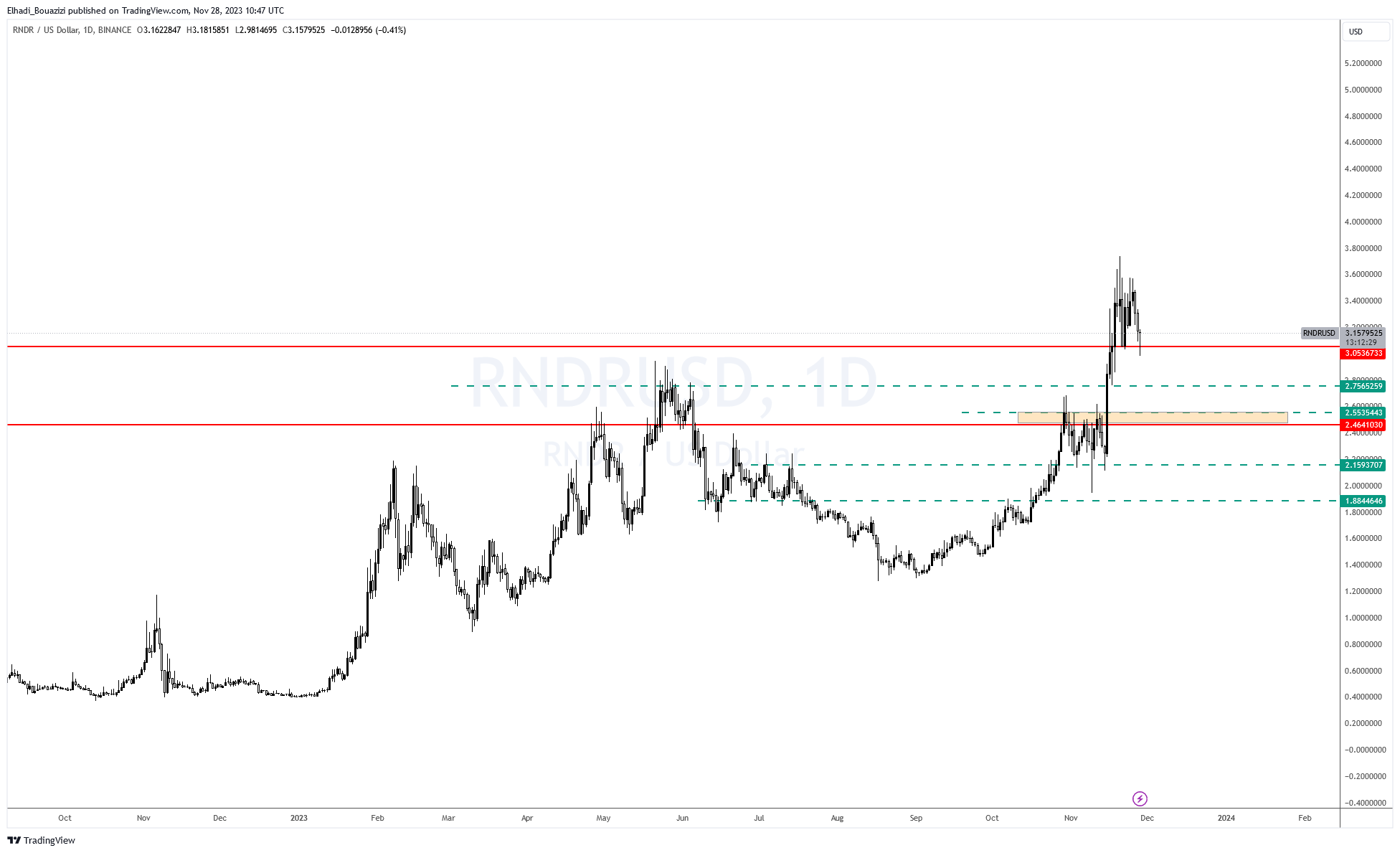 بعد هذا الارتفاع الحاد من المحتمل حدوث تصحيح. يتراوح راندر RNDR الآن عند مستوى الدعم 3.05 دولار. إذا تمكن من كسره فإن مستويات الدعم التالية وبالتالي مناطق الشراء توجد عند 2.75 دولار ثم 2.55 دولار. كما هو موضح على الرسم البياني اليومي المرفق.