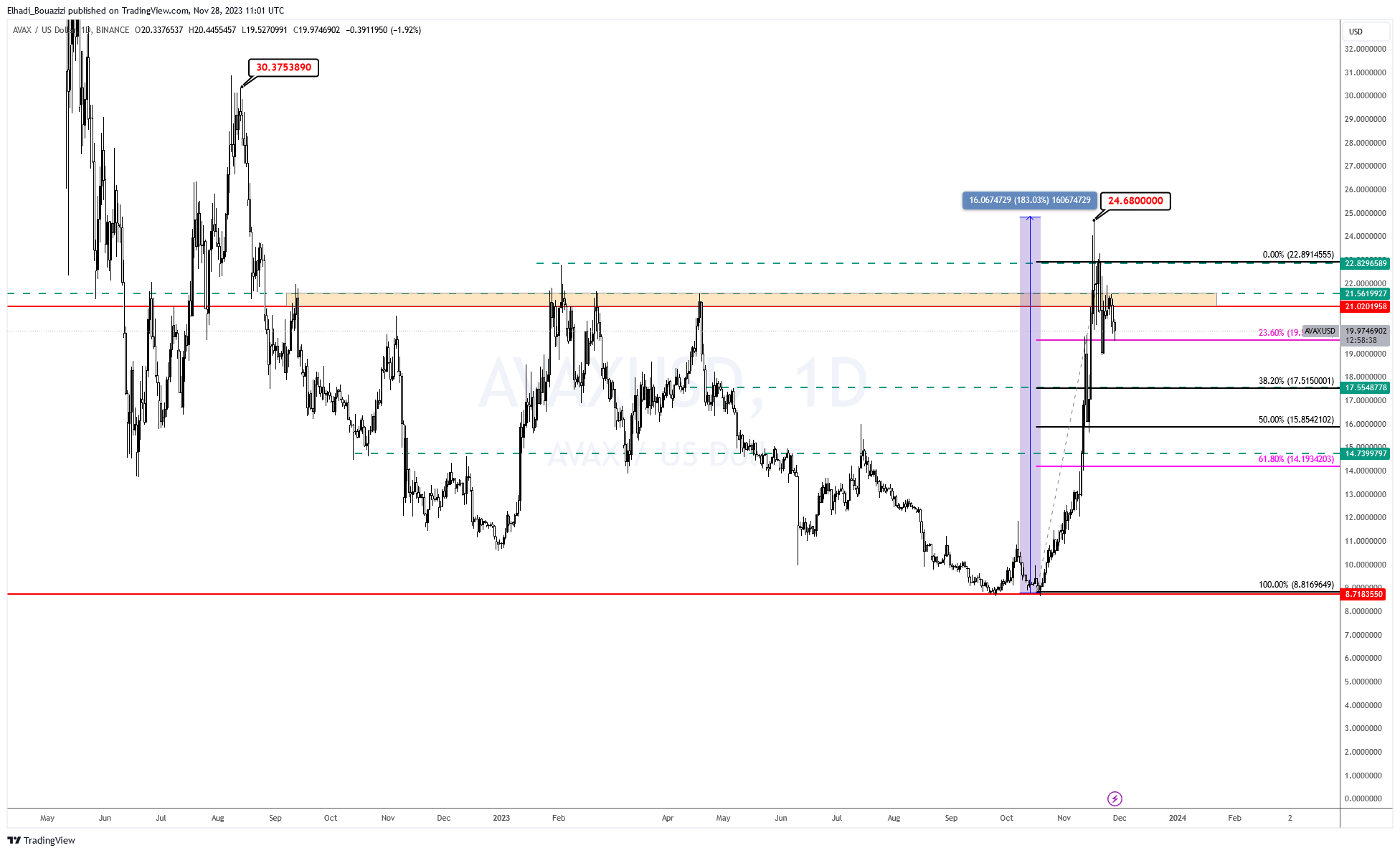 و أي تراجع لسعر عملة أفالانش AVAX نحو مستويات الدعم الموضحة في الرسم البياني المرفق و خاصة تصحيحات فيبوناتشي يمكن أن تمثل فرصة جيدة للشراء. و طبعا كلما هبط السعر أكثر كلما كانت المخاطر أقل.