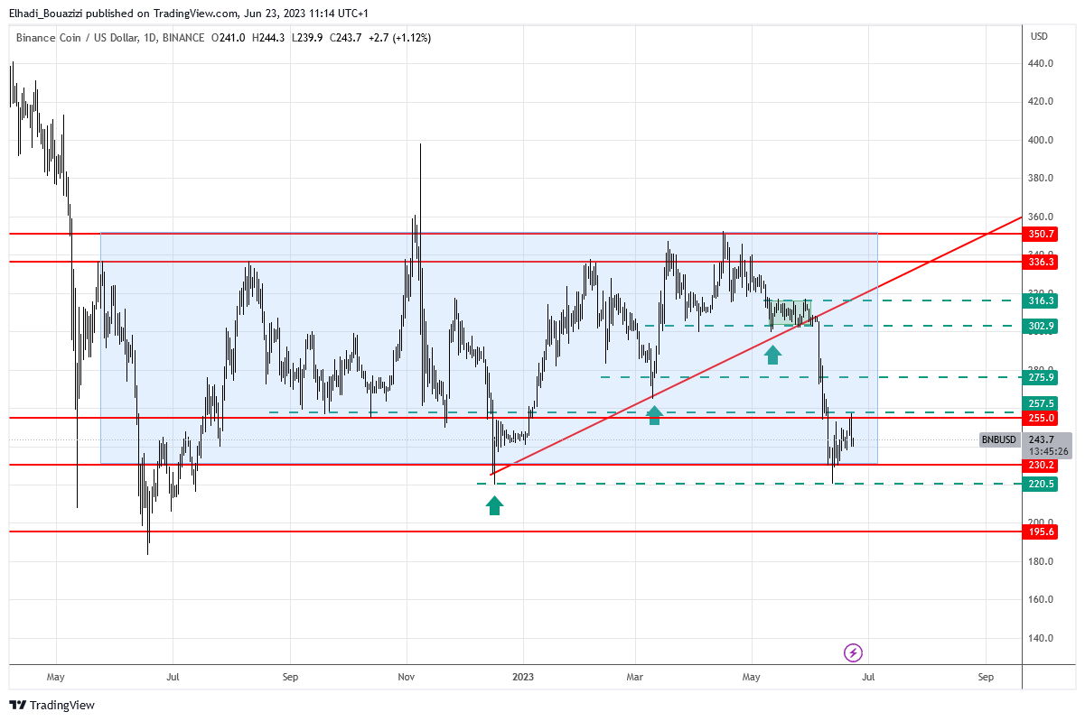 النظرة العامة على الرسم توضح أن سعر BNB ورغم الهبوط الحاد بقية في فوق الحد السفلي عند مستوى 230 دولار. للقناة السعرية الجانبية (المستطيل الأزرق) التي كانت يتداول داخلها من مايو عام 2022.