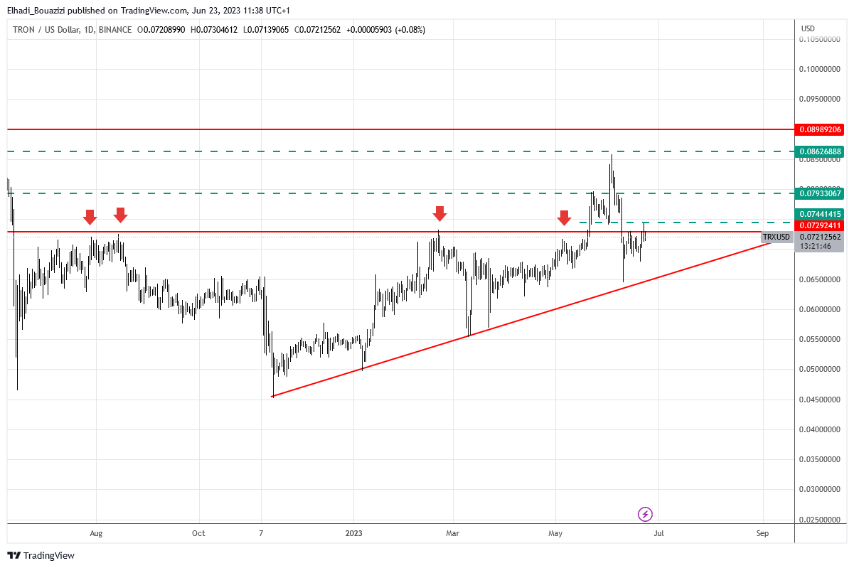 العامل الإيجابي هنا، هو أن سعر TRX يتحرك مع خط اتجاه (ترند) صاعد منذ نوفمبر 2022. وهو يمثل مستوى دعم قوي حتى الآن.