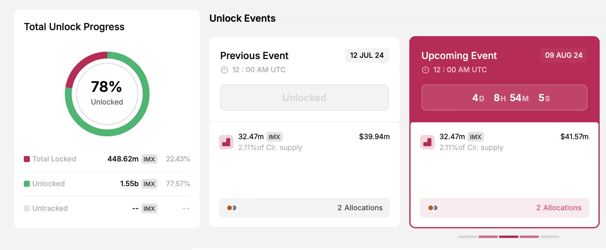 ايضا في 9 أغسطس، سيزداد العرض المتداول لـ IMX بمقدار 32.47 مليون رمز. سيتم تخصيص هذه العملات الرقمية المطلقة حديثًا لتطوير المشروع ونظام إميوتابل البيئي بشكل أوسع. تناقش المجتمع العملات الرقمية أداء IMX غير المثير للإعجاب، معزيًا ذلك إلى حد كبير بالإطلاقات المتكررة.
