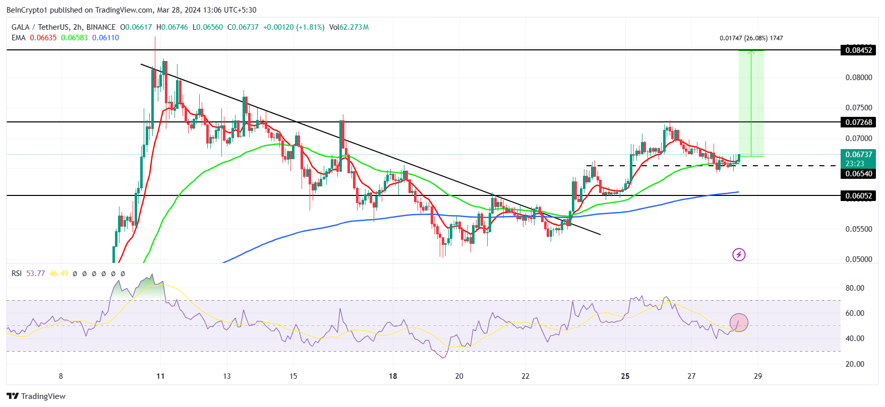 هذا يعني أن GALA لديها فرصة لمواصلة الارتفاع، والذي من شأنه أن يرسلها إلى 0.084 دولار.