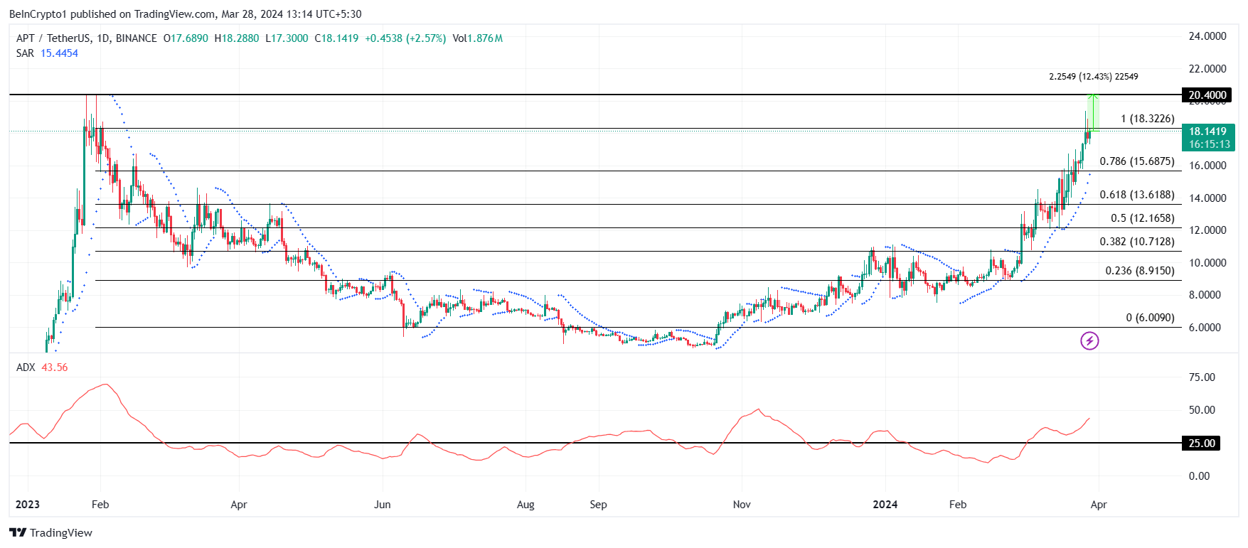 فاجأ سعر Aptos السوق بأكمله بارتفاعه الأخير، مما جعله يقترب من اختراق أعلى مستوى سابق على الإطلاق (ATH) البالغ 20.4 دولارًا. يقف سعر APT الآن على بعد أقل من 12.5% من اختراق ورسم ATH جديد.