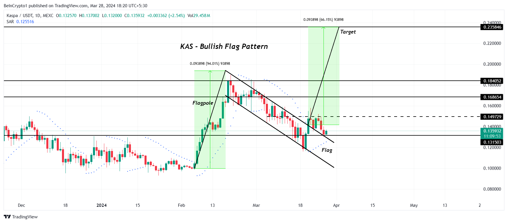 كان سعر Kaspa، الذي حقق ارتفاعًا كبيرًا الشهر الماضي، عالقًا في قناة هابطة خلال الشهر الماضي. اخترقت العملة الرقمية هذه القناة قبل أسبوع ويتم تداولها حاليًا عند 0.135 دولار، مختبرة مستوى الدعم 0.131 دولار.