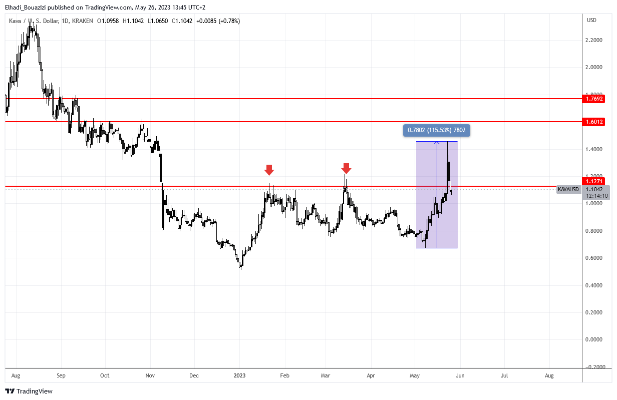 العملة الثانية في القائمة هي عملة KAVA التي ارتفعت بقوة بعد نجاح ترقية لشبكة المنظومة الرئيسية Kava 13 ارتفع سعر العملة الأصلية KAVA أكثر من 115% منذ 8 مايو الماضي صعودا من أدنى مستوياته التاريخية عند 0.672 دولا. (هذه الأرقام على منصة كراكن).