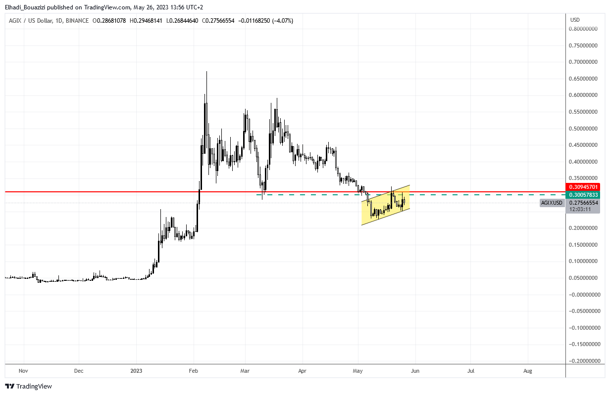 على الرسم البياني 4سا ، سعر عملة AGIX يتحرك في قناة سعرية صاعدة، و لكن رغم قوة الزخم الصاعد إلا أنه فشل في اختراق مستوى المقاومة القوي جدا 0.30 بعد أن اختبره مرتين في المدة الزمنية المذكورة.