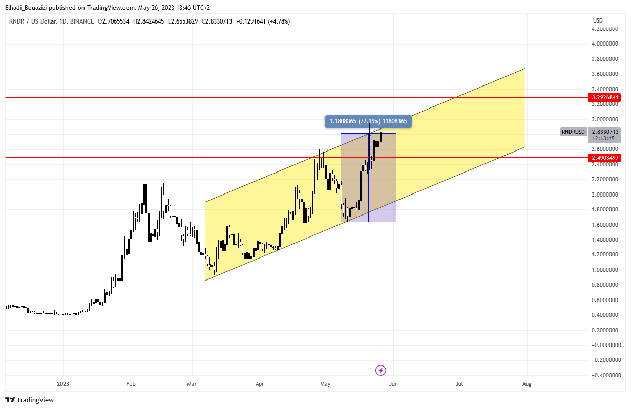 لقد سبق وتكلمنا في تقرير سابق عن عملة RNDR في بداية الأسبوع وأشرنا إلى احتمال استمرار حركة الصعود في حال أغلق السعر فوق مستوى المقاومة 2.50 دولار. وهذا بالضبط ما حدث، حيث استمرت العملة في الصعود. لتسجل بذلك نسبة ارتفاع بلغت أكثر من 72% منذ بداية هذه الموجة الصاعدة يوم 13 مايو الماضي.