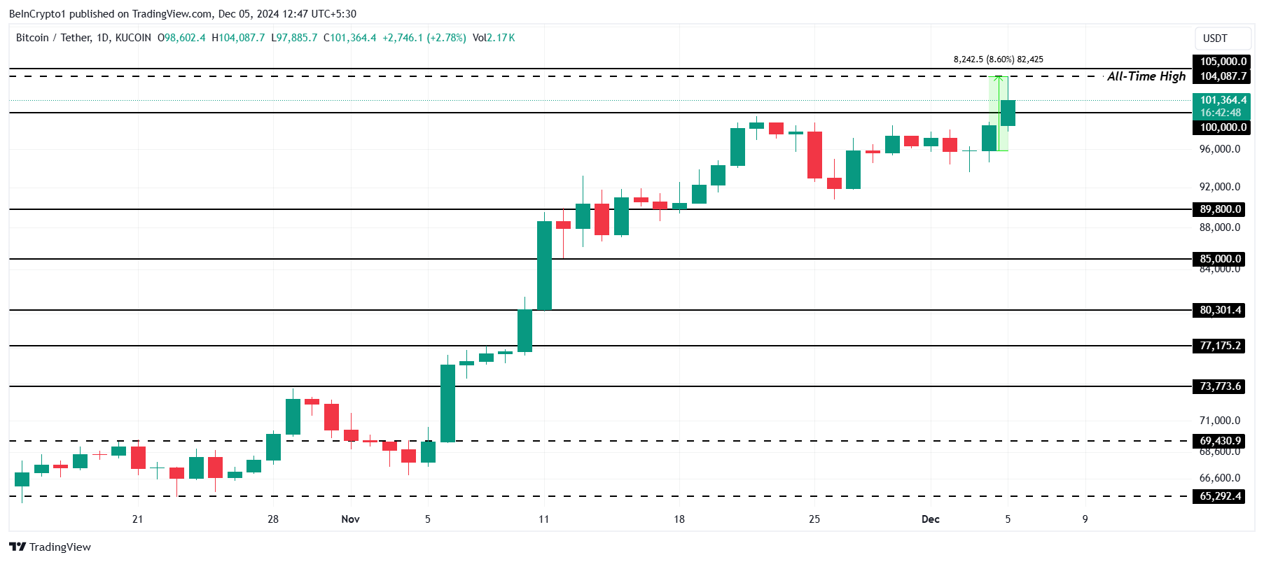 صنعت بيتكوين التاريخ اليوم، بارتفاع بنسبة 8,6٪ في آخر 24 ساعة لتتجاوز حاجز 100,000 دولار وتشكيل أعلى مستوى جديد على الإطلاق (ATH) بقيمة 104,087 دولار. يمثل هذا الارتفاع علامة فارقة كبيرة، مما يعزز التفاؤل في سوق العملات الرقمية. جلبت مسيرة BTC إياها أقرب إلى مرحلة جديدة من النمو.