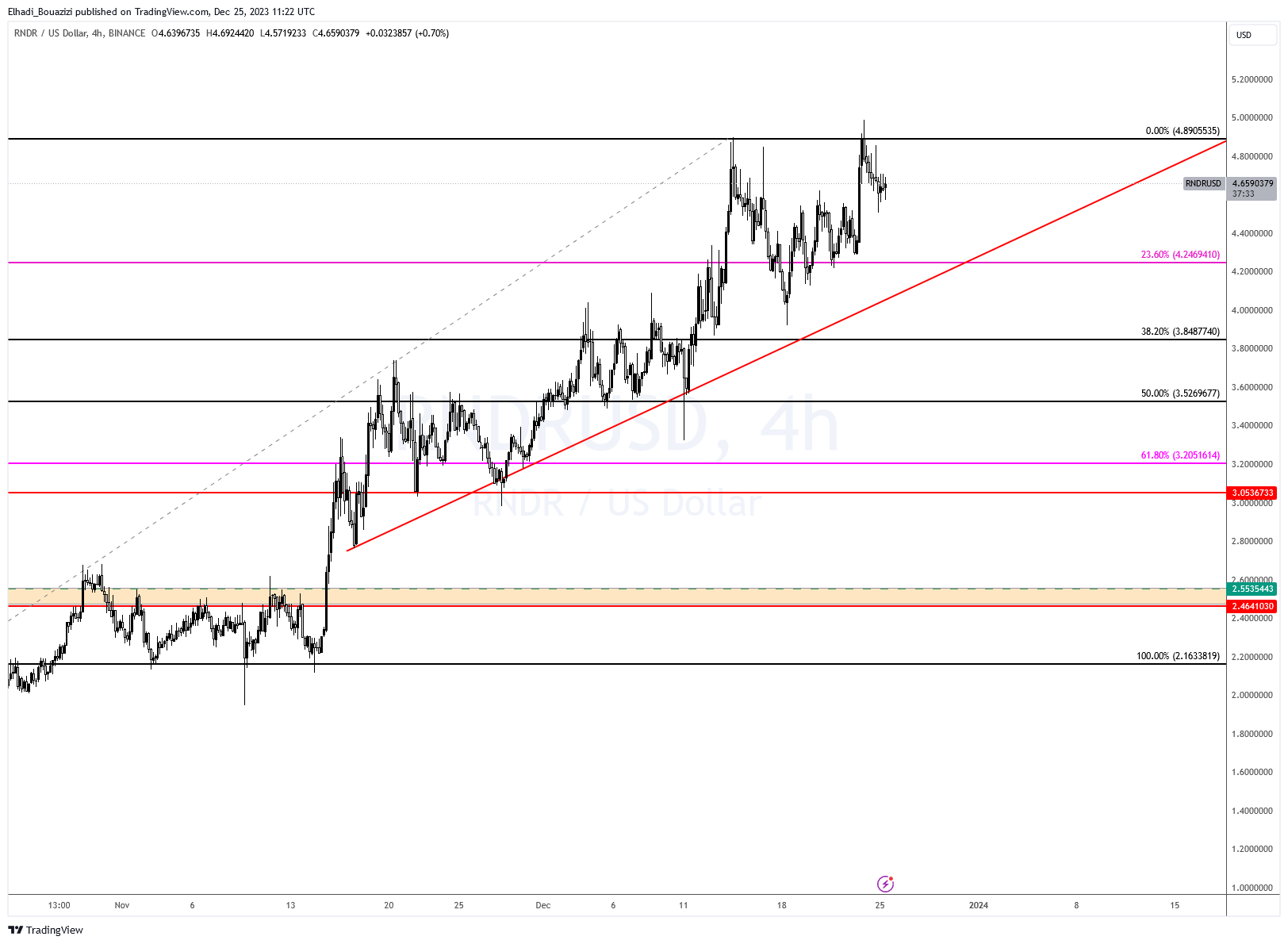 وفعلا صعد سعر RNDR وبلغ ذروة جديد عند 4.98 دولار، قبل أن يترد ويتداول عند سعر 4.66 دولار.
