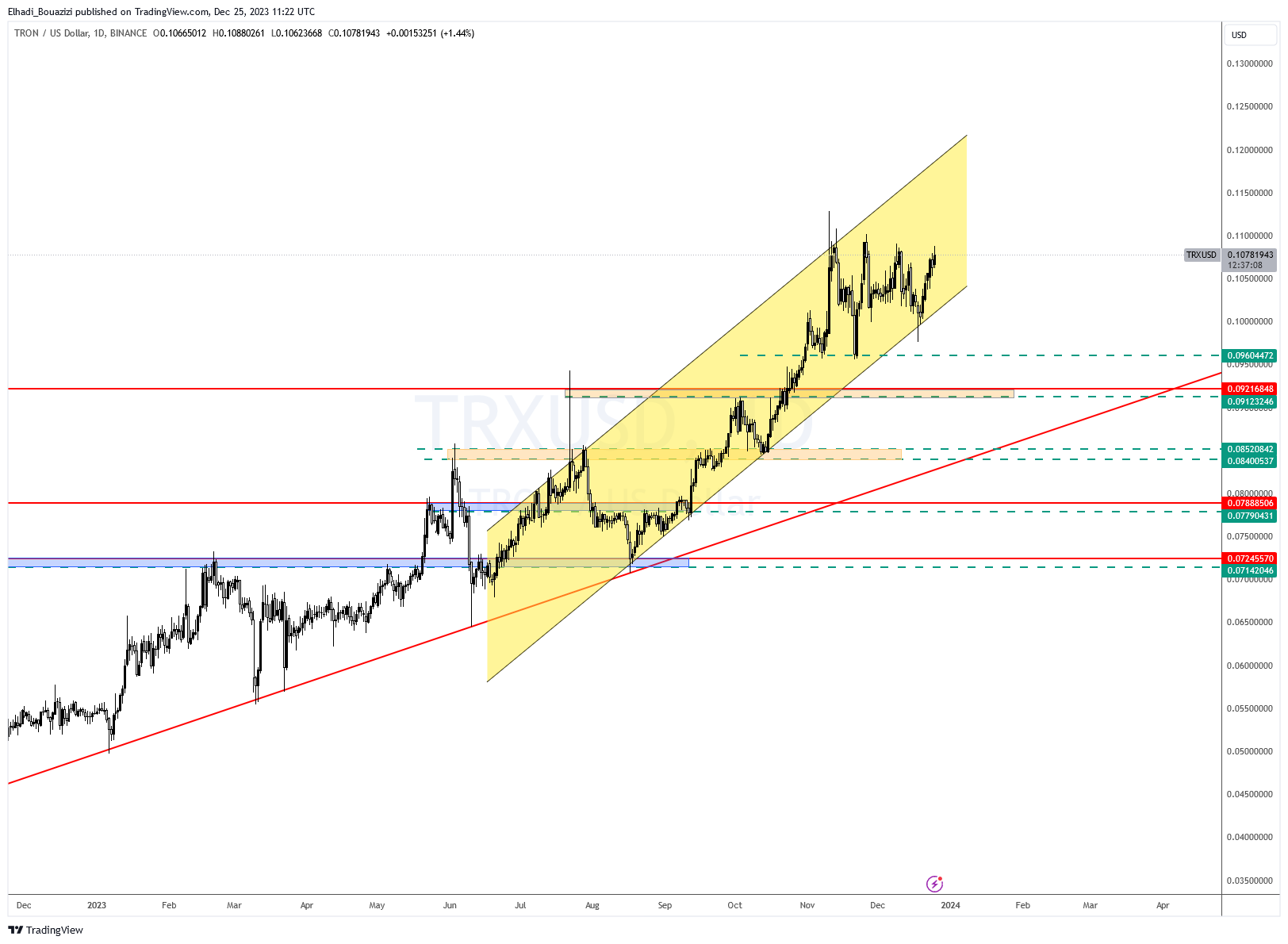 حيث توقعنا ارتداد السعر من الحد السفلي لهذه القناة الذي يمثل منطقة شراء جيدة. ثم تأتي منطقة الدعم 0.092 دولار وطبعًا خط الاتجاه.