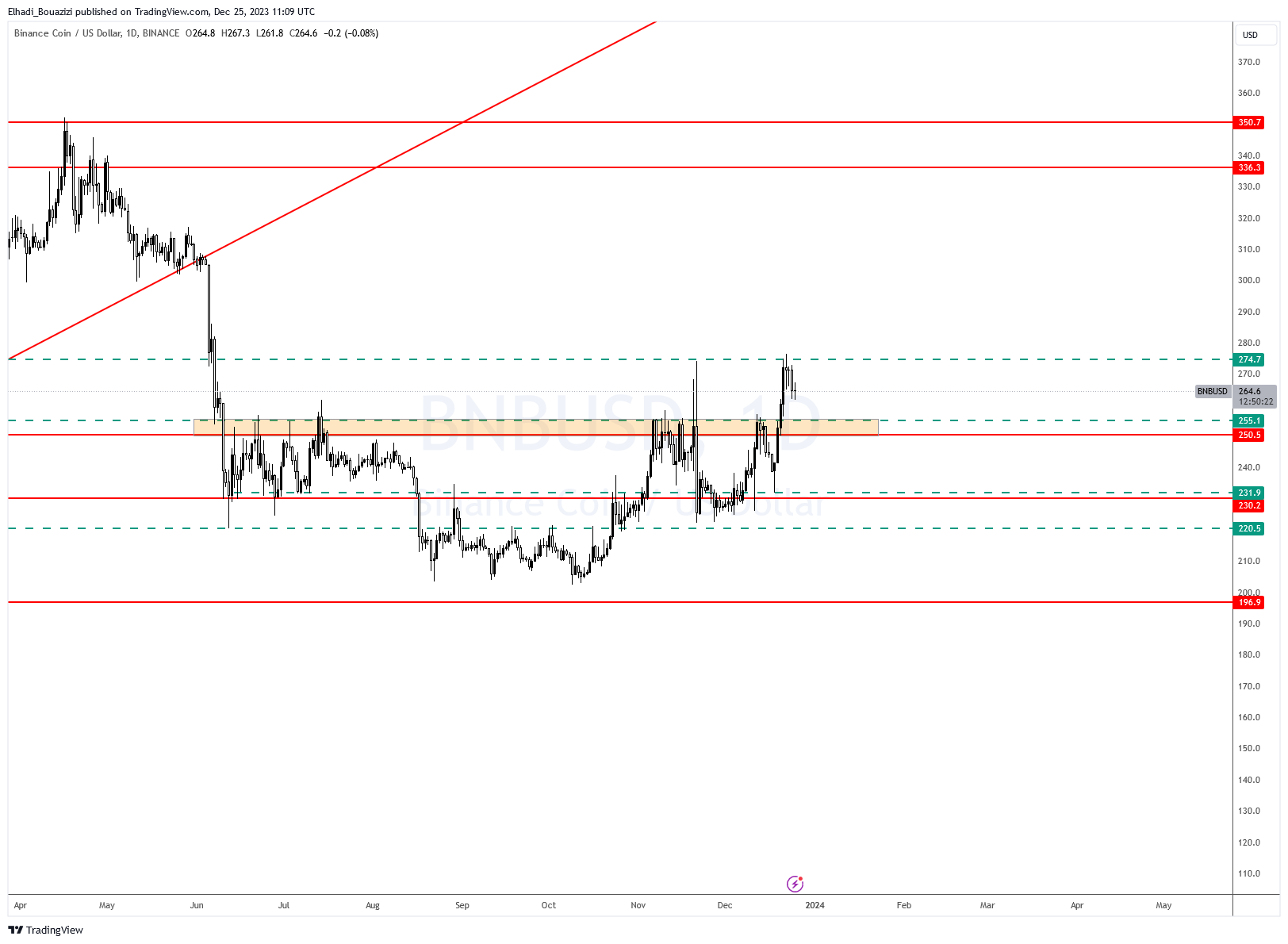 ارتد سعر BNB بعد أن لامس مستوى المقاومة 275 دولار. وهو الآن يتداول عند سعر 265 دولار. من المحتمل أن نشهد إعادة اختبار المستوى 255 دولار قبل مواصلة الارتفاع.