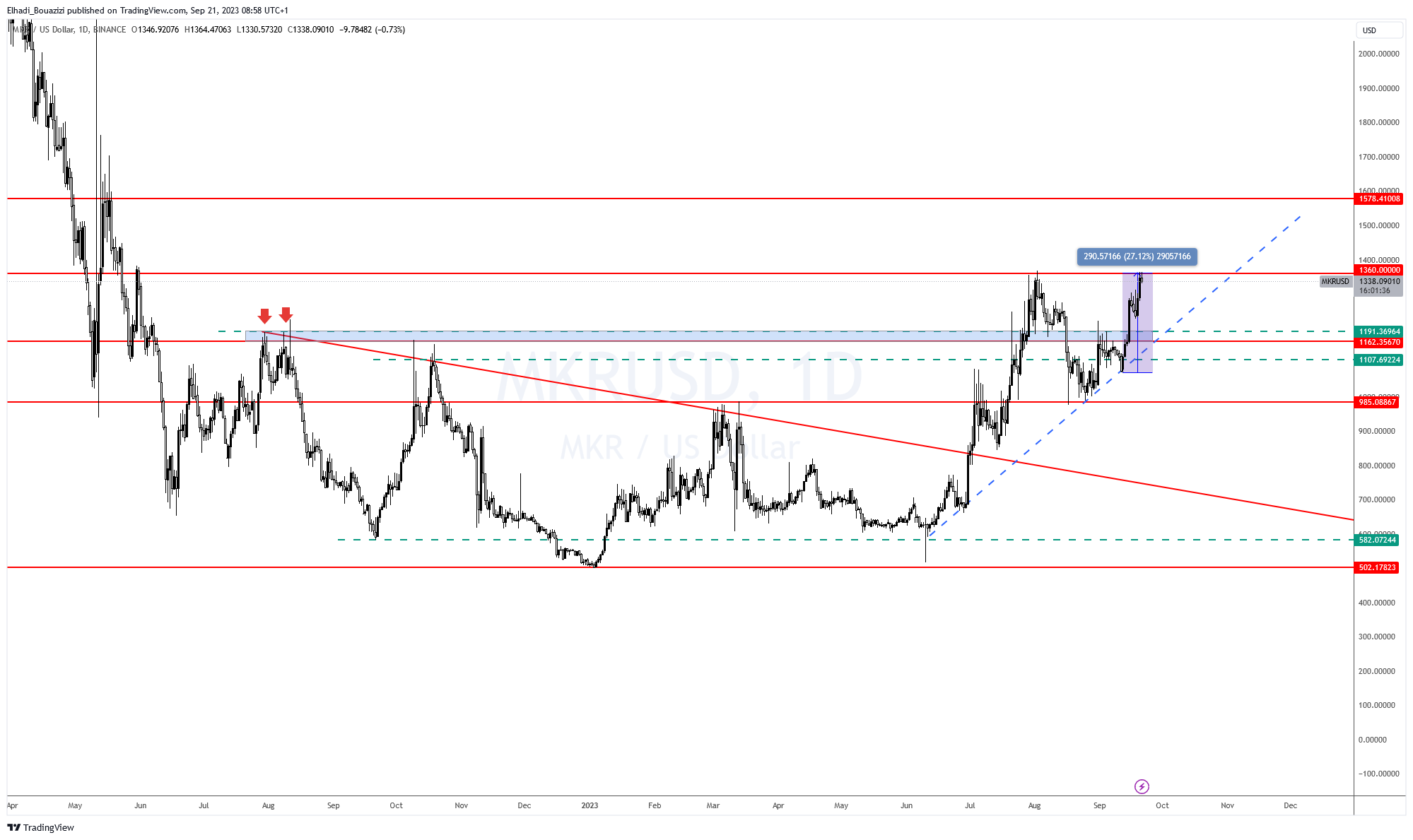 Sponsored Sponsoredسعر عملة مايكر MKR يتداول، عند 1330 دولار مباشرة تحت حاجز المقاومة القوي جدا 1360 دولار. و الذي يمثل القمة السعرية للعملة المشفرة هذا العام.