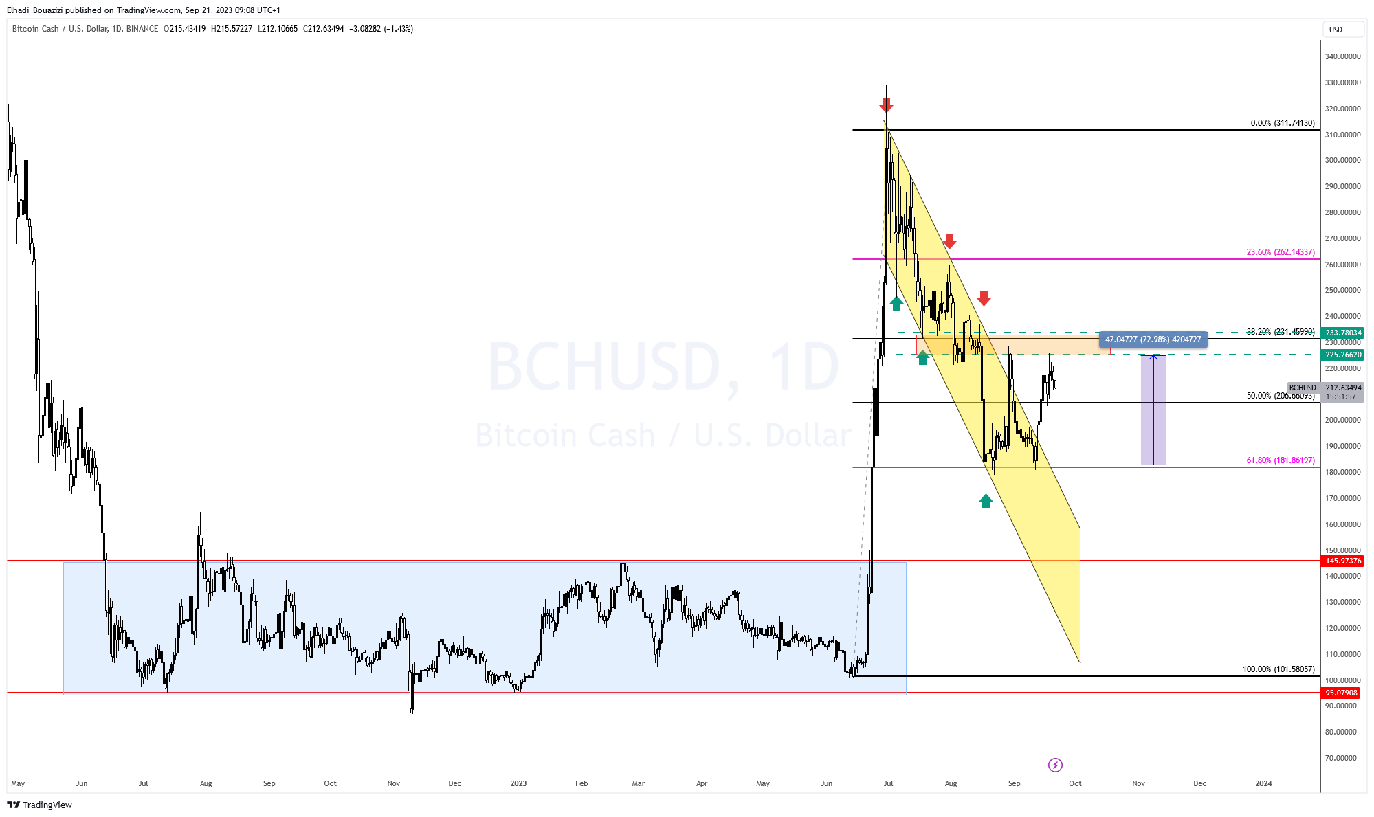 الآن، سعر بيتكوين كاش BCH يواجه مقاومة عند تصحيح فيبوناتشي 38.2% عند سعر 230 دولار. السعر تذبذب تحت هذه المنطقة لعدة أيام.