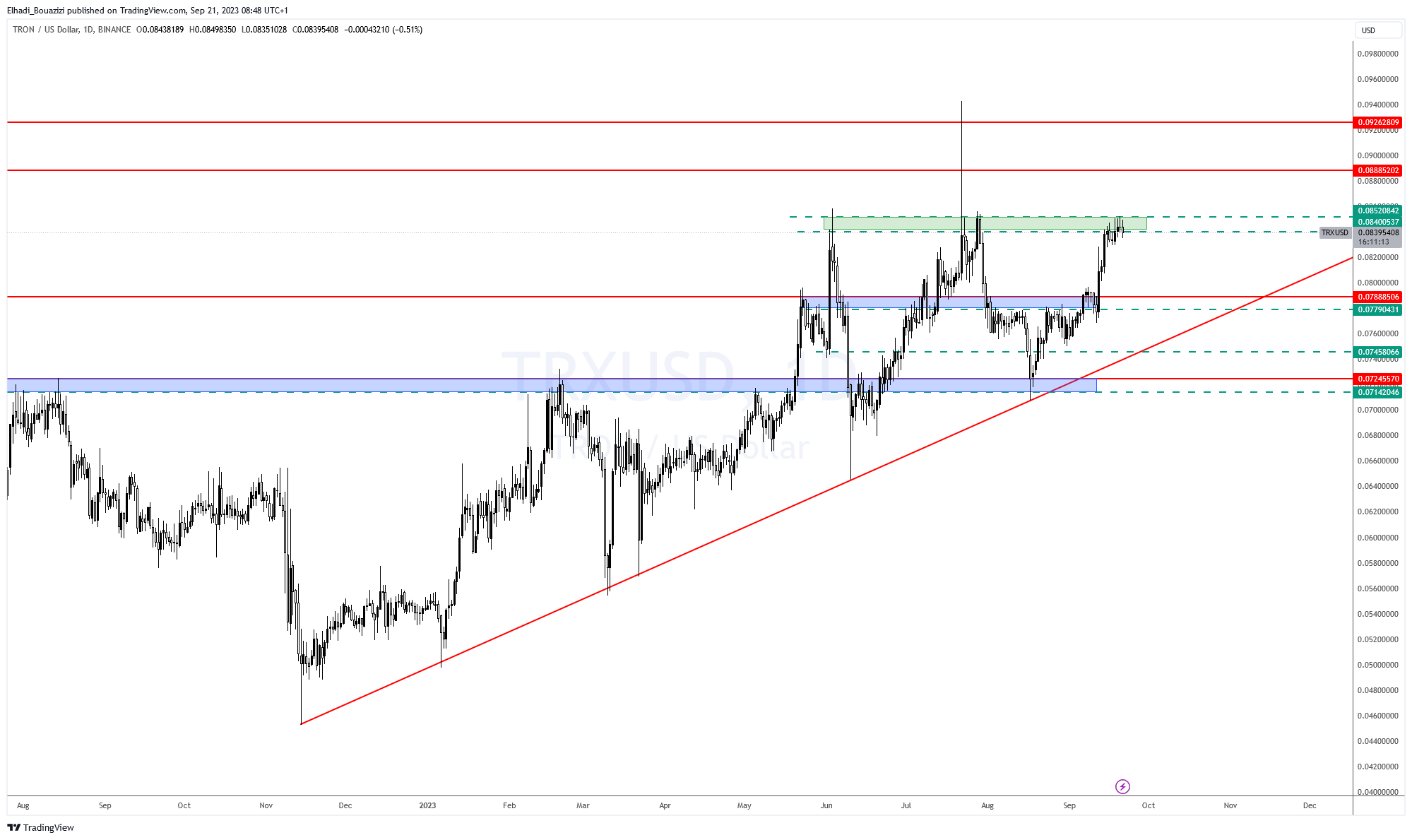 و لكن في حالة، تتمكن سعر ترون TRX من اختراق حاجز المقاومة المذكور. فإن الهدف التالي سيكون 0.089 ثم 0.092 دولار.
