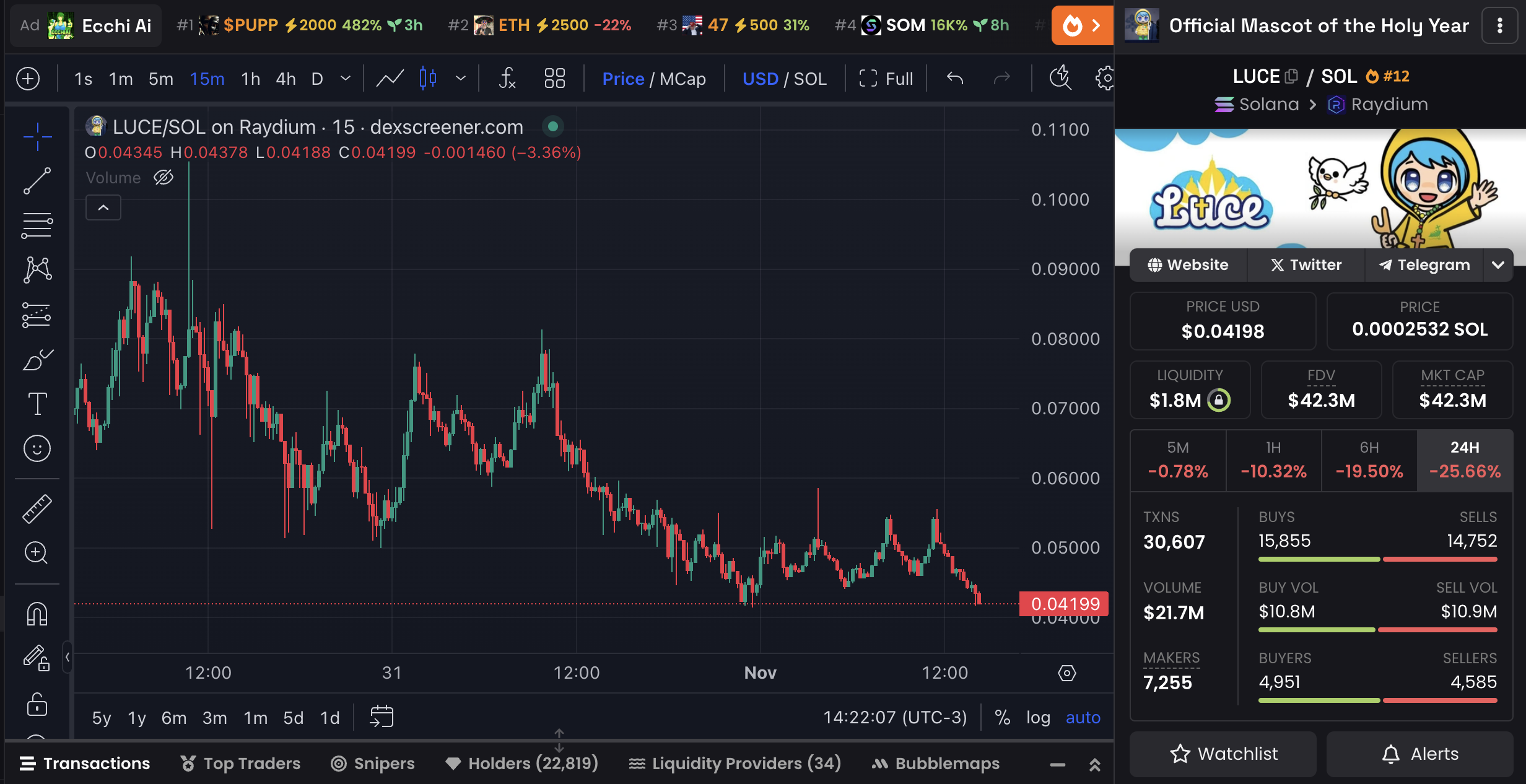 أُطلق LUCE قبل أربعة أيام فقط وسرعان ما أصبح منافسًا قويًا بين عملات الميم في نظام سولانا. تم تقديمه في البداية على بامبفن، وسرعان ما تخرج إلى رايديوم، حيث جذب أكثر من 30,000 معاملة يوميًا.