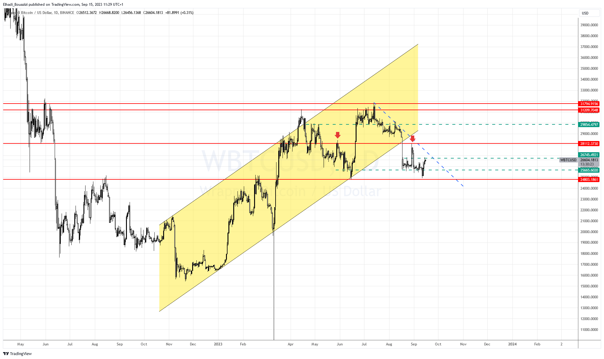 على الرسم البياني اليومي سعر عملة WBTC كان يتحرك في قناة سعرية صاعدة بدأت في التشكل في شهر نوفمبر من العام الماضي 2022. و لكنه كسرها في موجة الهبوط الأخيرة في 17 أغسطس الماضي.