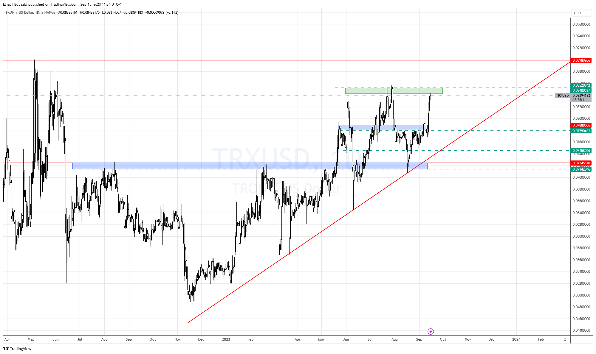 كان سعر عملة ترون TRX من بين الأفضل في سوق العملات المشفرة خلال الفترة الماضية. كنا قد تحدثنا منذ يومين عن أداء عملة ترون TRX و توقعنا استمرار صعود السعر نحو مستوى منطقة المقاومة 0.084 – 0.085 دولار. و لقد وصل على تلك المنطقة أن يتداول الآن في وقت كتابة هذا التحليل.