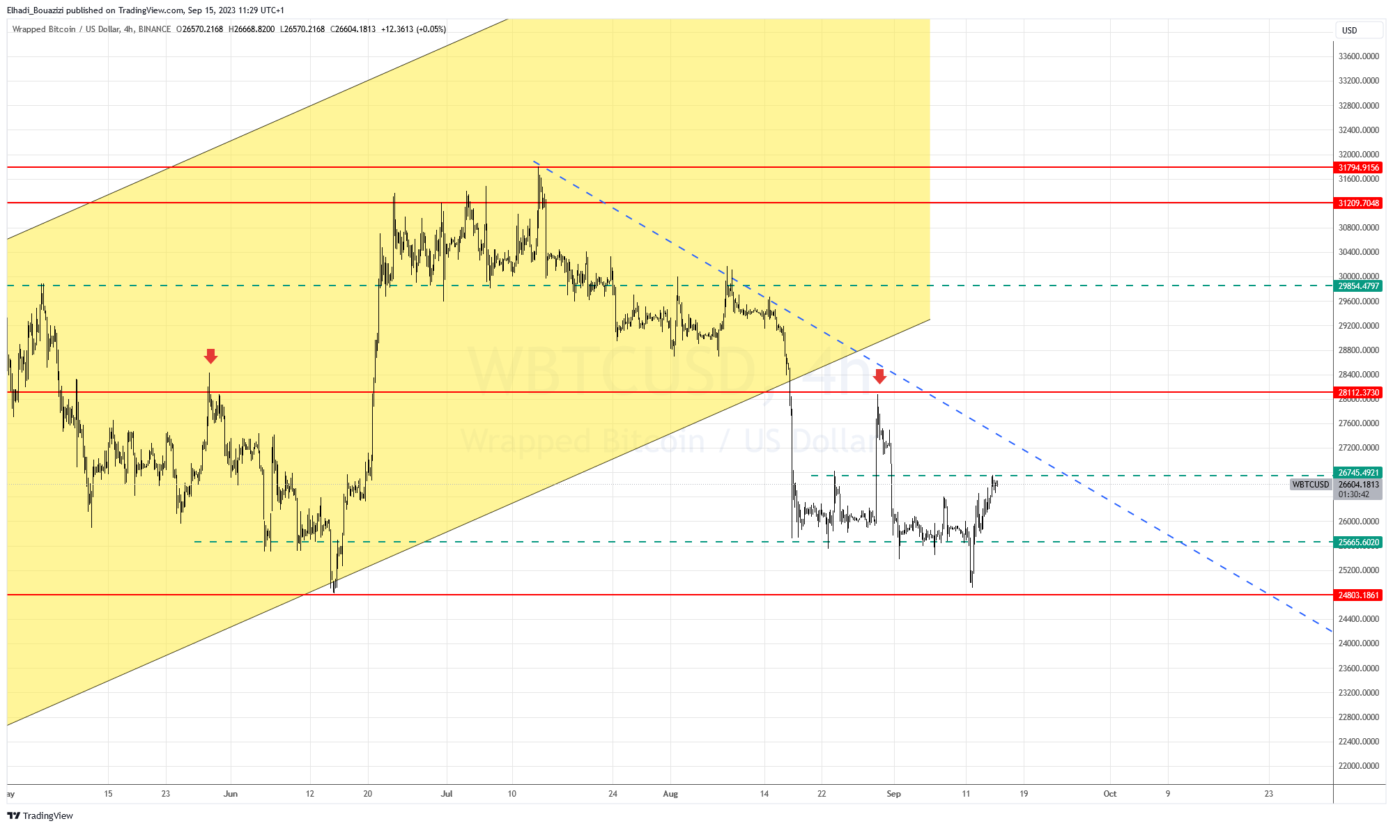 على الرسم البياني 4سا، سعر عملة WBTC يتحرك تحت خط اتجاه الهابط. السعر الآن يتداول بالقرب من مستوى المقاومة 26745 دولار مباسرة تحت هذا الخط.