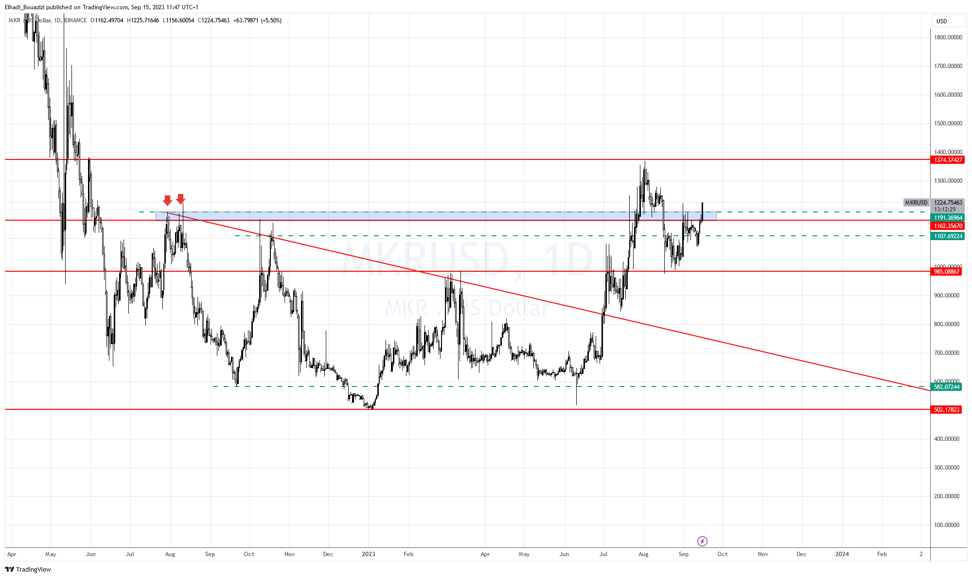 على الرسم البياني اليومي لسعر عملة مايكر MKR. نلاحظ أنه تمكن من اختراق مستوى المقاومة 1162 دولار. في حال استمرار الموجة الصاعدة. من المحتمل أن يعود السعر لاختباره. قبل أن يستمر في الصعود نحو مستوى 1250 دولار ثم 1300 دولار.