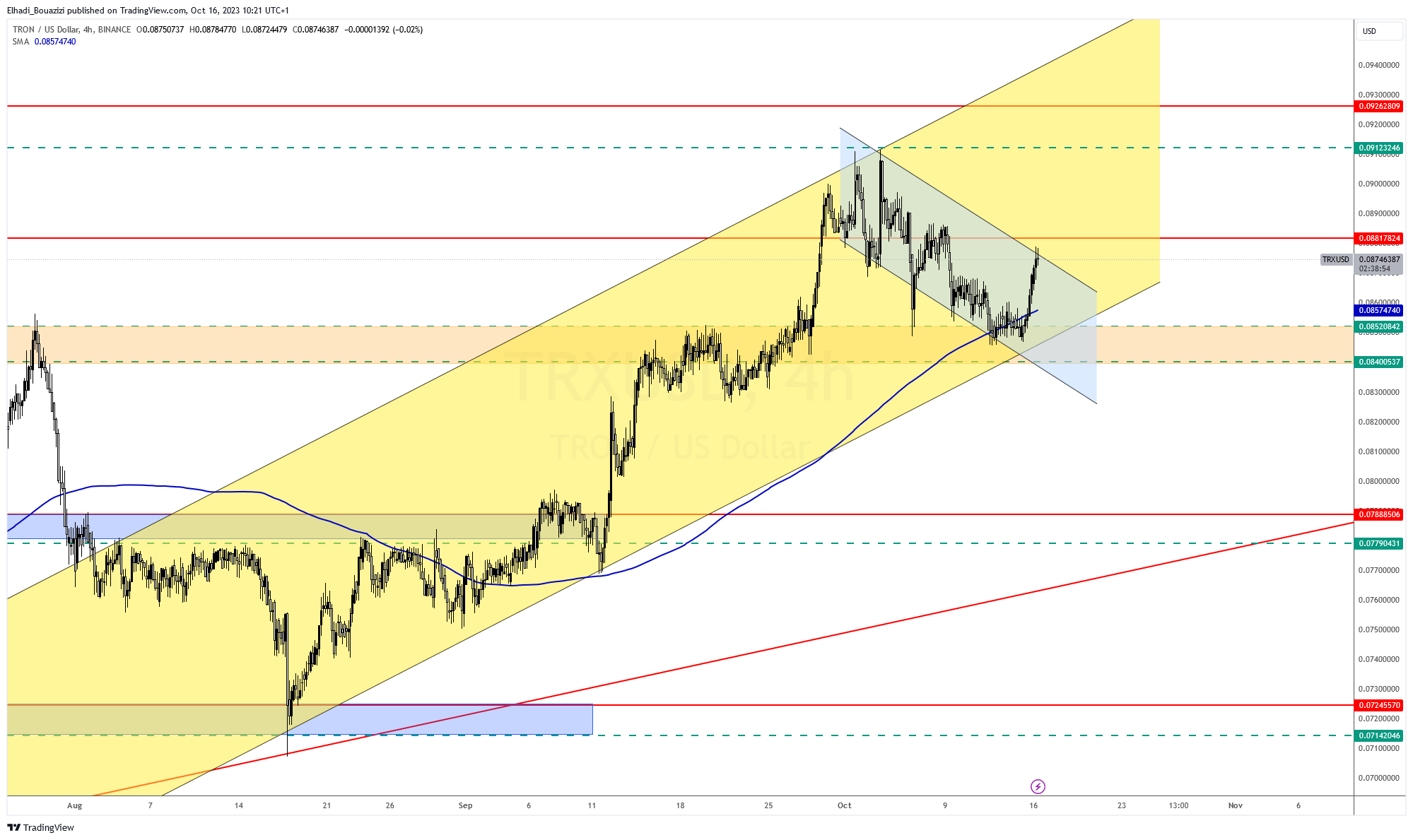 و كما أشرنا، في آخر تحليل ارتفاع سعر ترون TRX بعد أن لامس مستوى دعم قوي جدا عند سعر 0.084 – 0.085 دولار.
