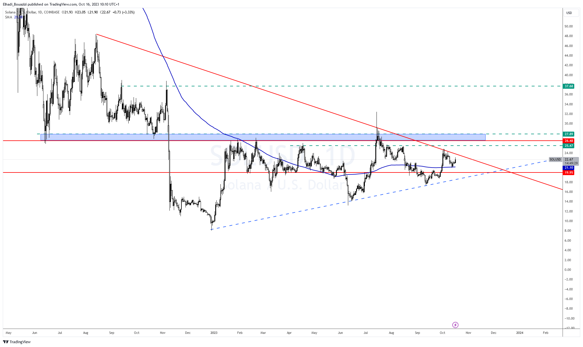 على الرسم البيان اليومي نلاحظ أن سعر سولانا SOL يتحرك بين خطي اتجاه، واحد صاعد و الآخر هابط. و لقد ارتفاع السعر هذه المرة عند منطقة الدعم المحصورة بين 21.2 – 21.7 دولار. أين يوجد تصحيح فيبوناتشي 50% و المتوسط المتحرك 200 يوم.