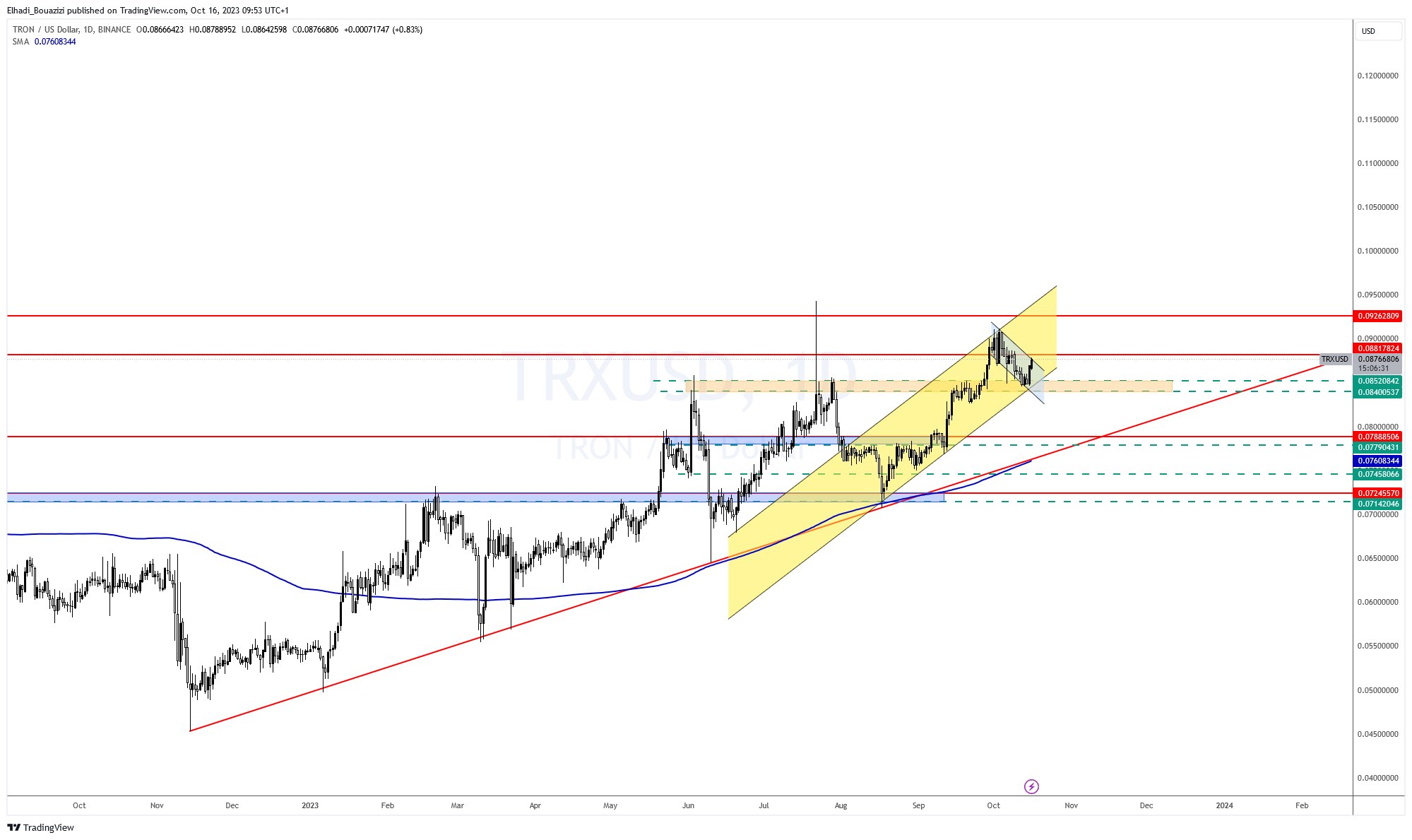 يواجه سعر ترون TRX مقاومة عند سعر 0.088 دولار و الحد العلوي للقناة السعرية الهابطة الجانبية (باللون الأزرق). في حالة اختراقها فإن الهدف التالي سيكون 0.091 دولار.