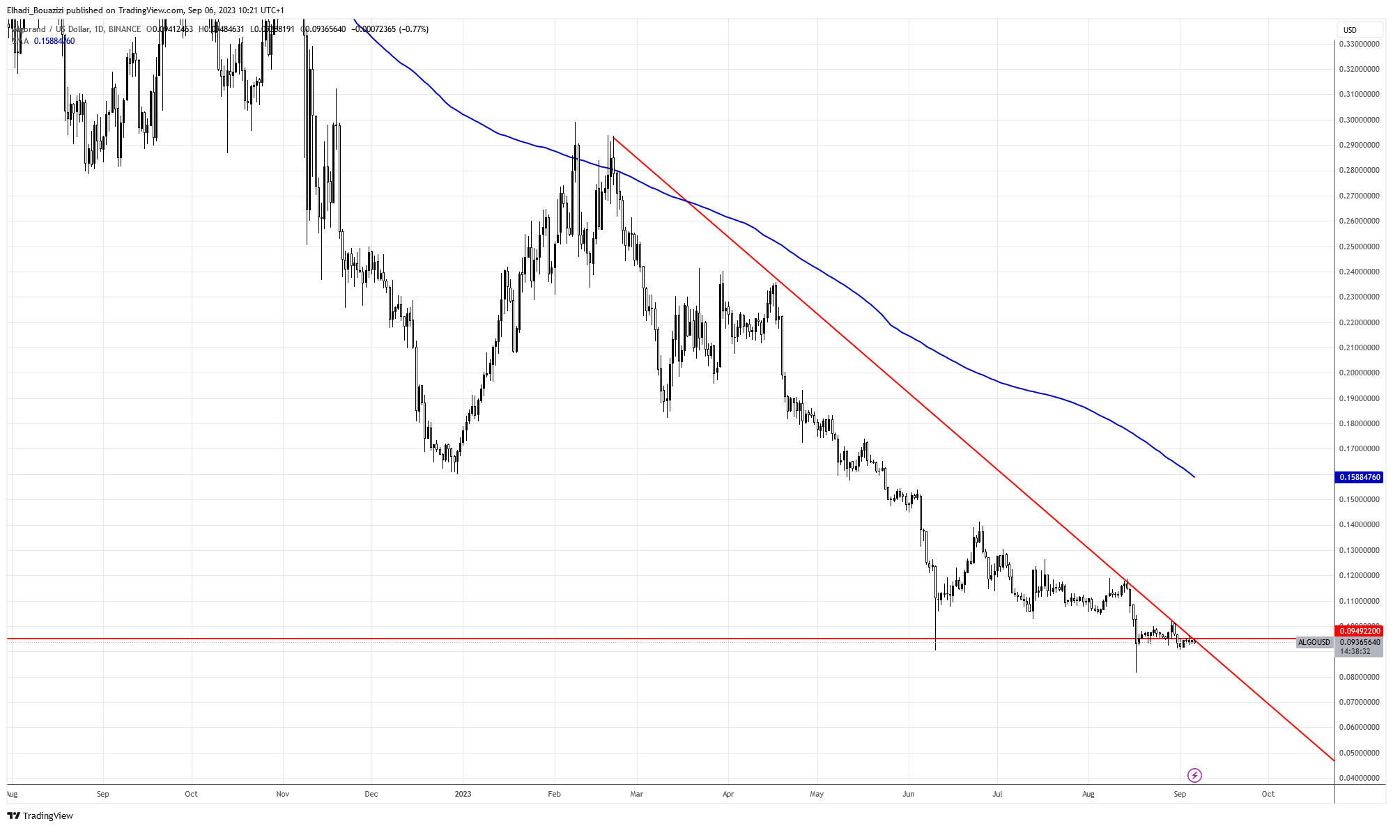 وكما نلاحظ على الرسم البياني اليومي لسعر عملة ALGO. فإن يتحرك تحت خط اتجاه هابط بحدّة. كما أن السعر كسر مستوى الدعم 0.094 دولار ويبلغ أدنى مستوياته التاريخية عند 0.081 دولار.