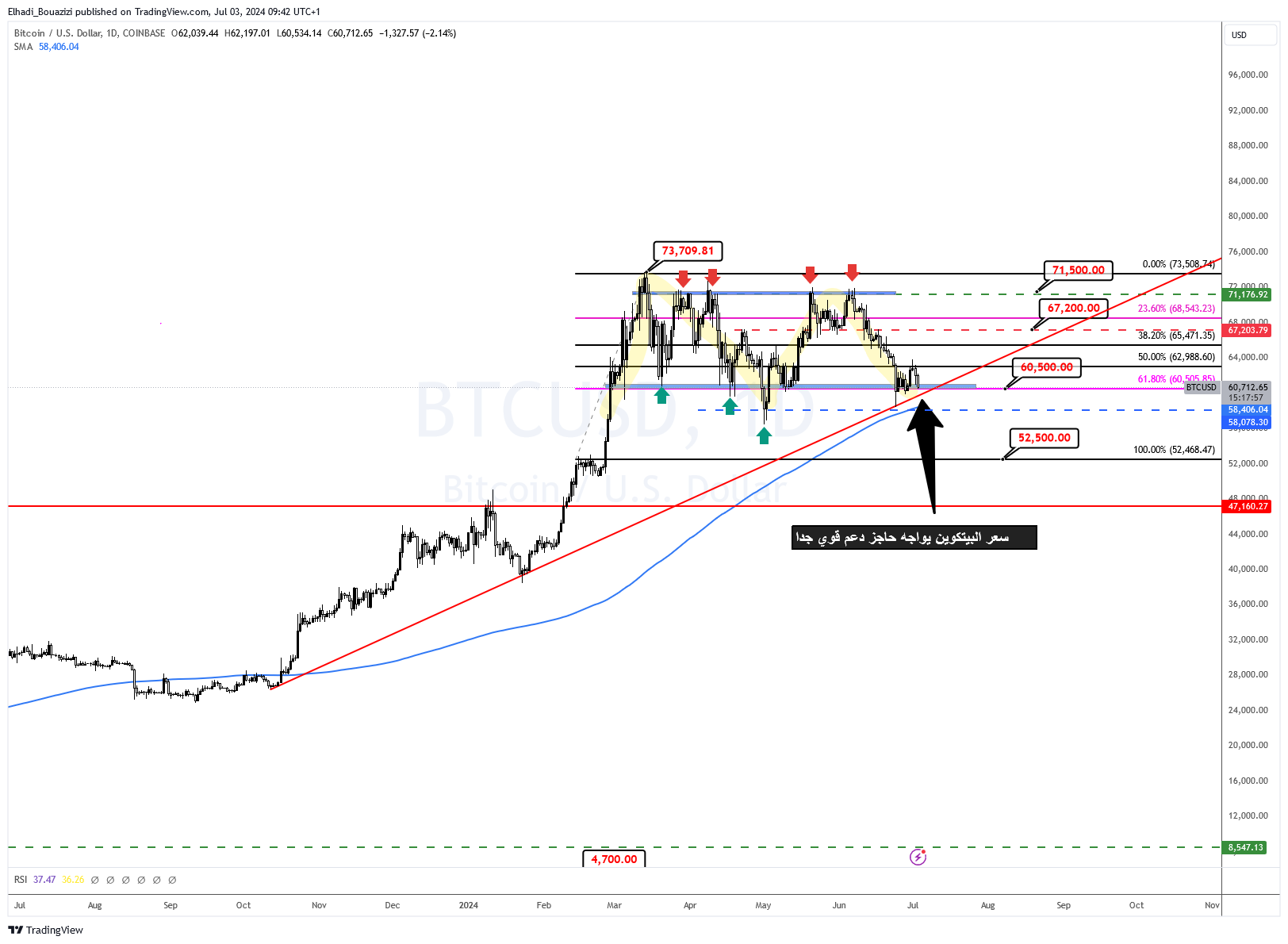 فنيا سعر البيتكوين ما زال صامد فوق مستوى للدعم المحوري و خط الاتجاه الصاعد و المتوسط الحسابي 200 يوم. حتى يتحقق سيناريو الهبوط نحو مستوى 52,000 دولار، يجب الإغلاق تحت هذه المستويات الفنية.