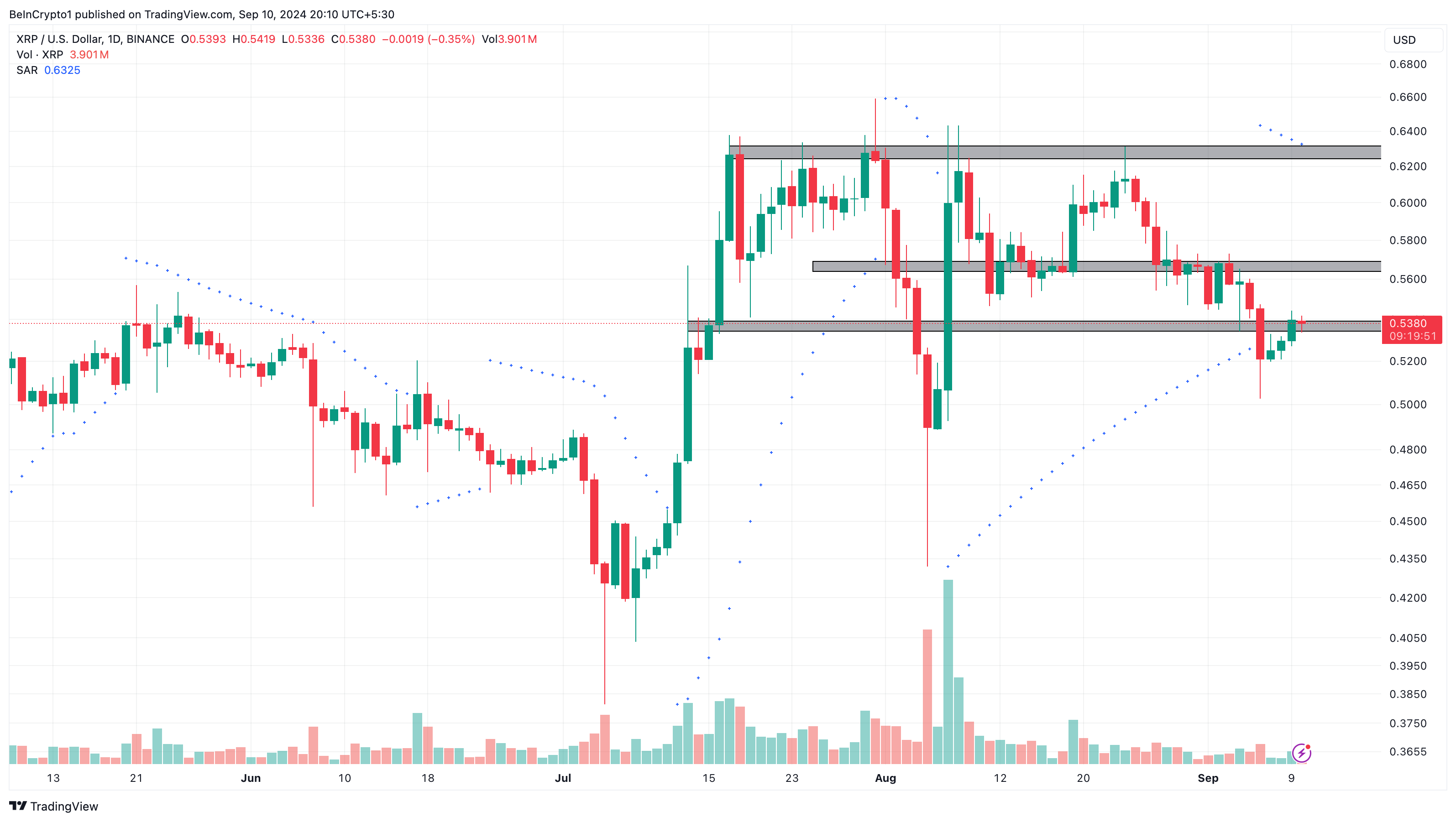 في أغسطس، ارتفع سعر عملة XRP إلى 0,61$ بعد أن أشار SAR إلى انعكاس صعودي. ولكن في وقت كتابة هذا التقرير، تموضعت الخطوط المنقطة فوق قيمة العملة البديلة، مما يشير إلى أنها قد تواجه مقاومة بين 0,57$ و0,63$.