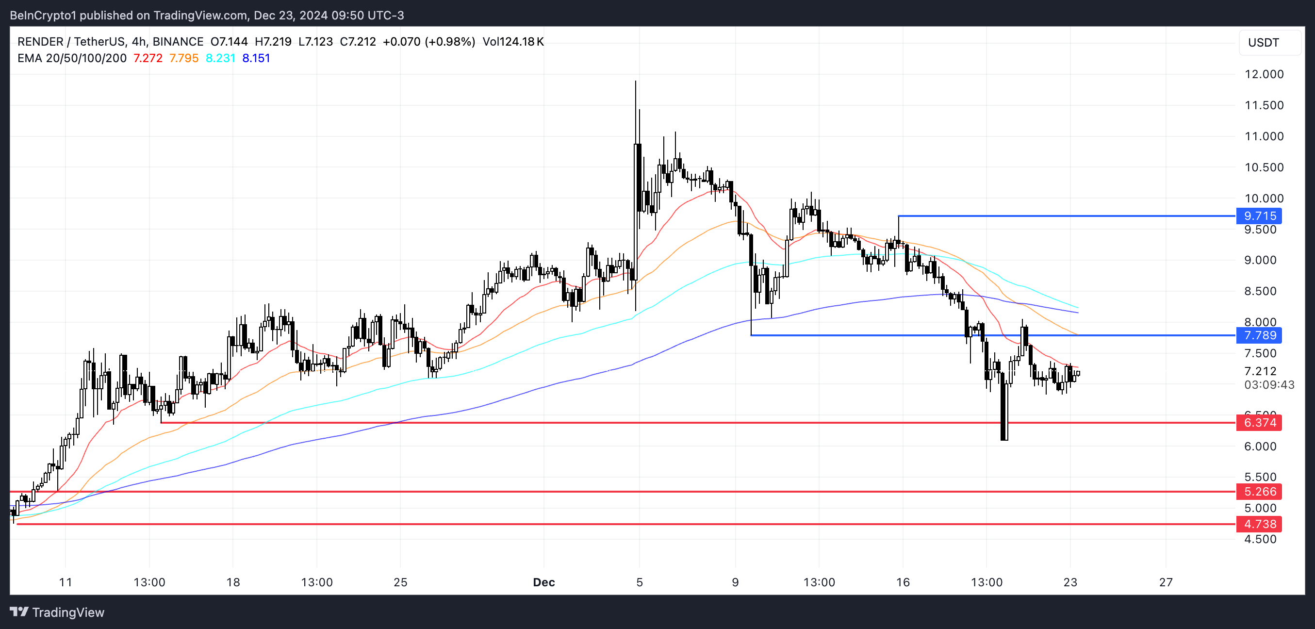 حاليًا، يتم تداول ريندر بالقرب من مستوى دعم حاسم يبلغ $6,37، مع مقاومة حول $7,78. يمكن أن يمهد الاختراق الناجح فوق هذه المقاومة الطريق لارتفاع نحو $9,71.