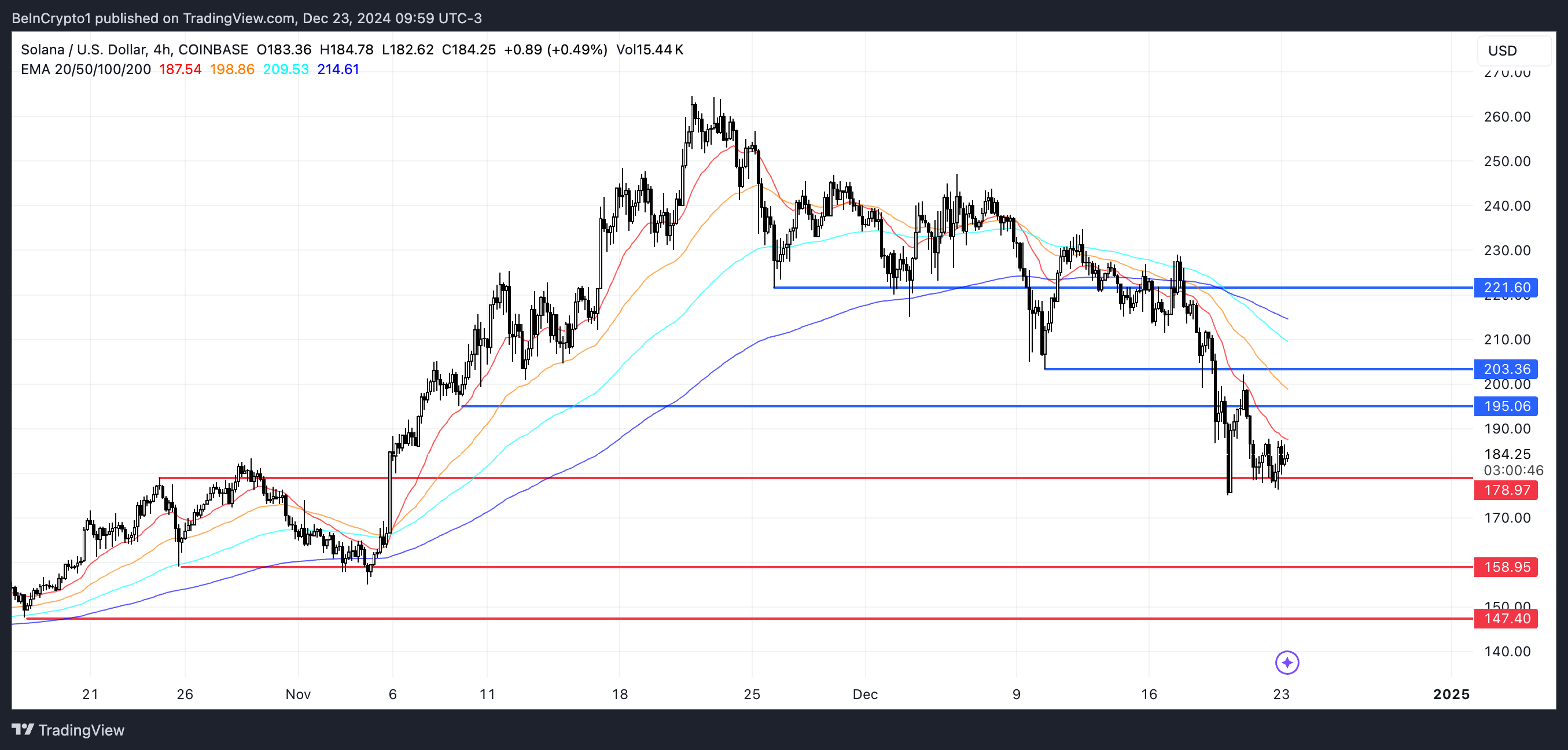 بالنظر إلى المستقبل، يعتمد حركة سعر سول على مستويات الدعم والمقاومة الرئيسية. يقع الدعم الحاسم التالي عند $178؛ إذا فشل هذا المستوى، قد تواجه سول مزيدًا من الانخفاضات، مع احتمال اختبار $158 و$147.
