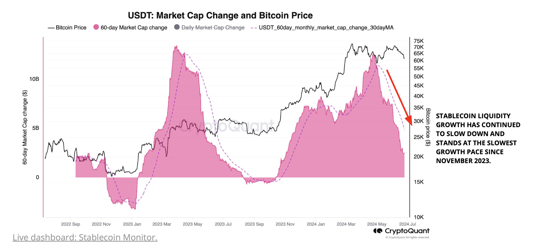 يعتبر نمو رأس مال سوق عملة تيثر USDT مؤشرًا للسيولة في سوق العملات المشفرة. بعد أن بلغ ذروته بـ 12,6 مليار دولار في أواخر أبريل، تباطأ النمو خلال الـ 60 يومًا الماضية بشكل كبير إلى 2,5 مليار دولار فقط، وهو أبطأ وتيرة منذ نوفمبر 2023.
