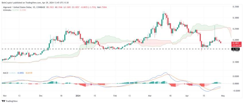 تمكن سعر ألجوراند (ALGO) من الحفاظ على 0.158 دولار كمستوى دعم منذ بداية عام 2024، حيث اختبره مرتين. في بداية الأسبوع الماضي، ارتدت العملة البديلة من نفس الدعم لتتداول عند 0.185 دولار. ومع ذلك، تشير التوقعات إلى أن سعر ALGO معرض لخطر السقوط تحت هذا المستوى هذه المرة.